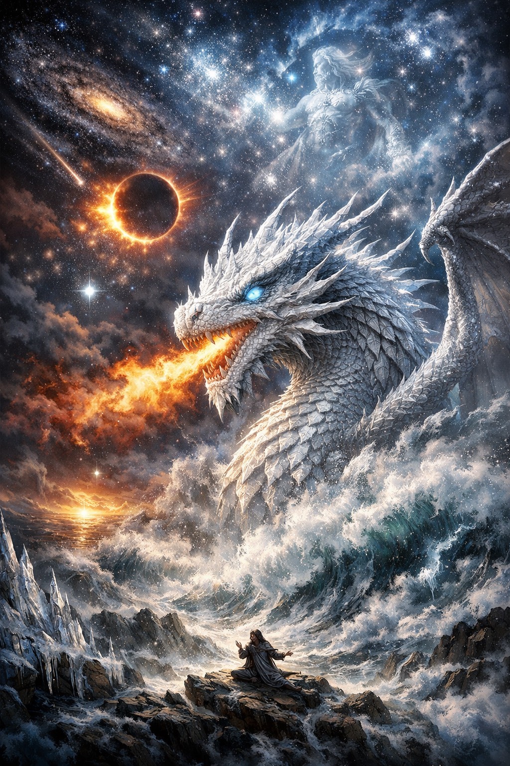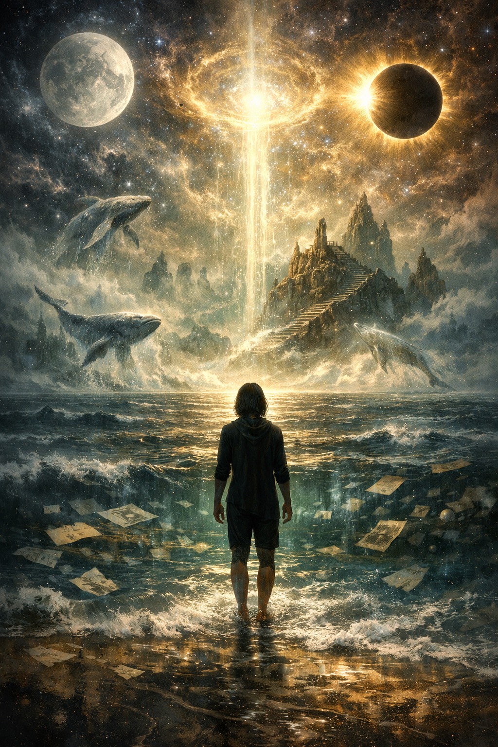 Epic progressive alt-rock/metal suite, 9-11 minutes, slow 70-85 BPM, odd meters (7/8, 5/4, 11/8), polyrhythmic tribal drums with dynamic sparse-to-massive builds, Intricate layered guitars: clean delayed arpeggios soaring high, heavy drop-tuned riffs, bending overtones, Deep funky groovy bass with slap counterpoint, fluid fills, prominent throughout, Atmospheric synth pads, organ swells, subtle DJ scratches, Multi-tracked male vocals: haunting mid-range rap-sung verses with Incubus-style rhythmic enunciation and emotional vulnerability, building to emotive falsetto choruses and layered vocalise, Slow-burning tension, extended ambient intros/instrumentals/solos, philosophical mystical mood, Majestic ominous blend of symphonic prog elegance, alt-metal weight, infectious funky groove—profound soaring emotional height and crushing low-end depth, Spacious arrangement, no rushed vocals, emphasize breathing pauses and gradual builds