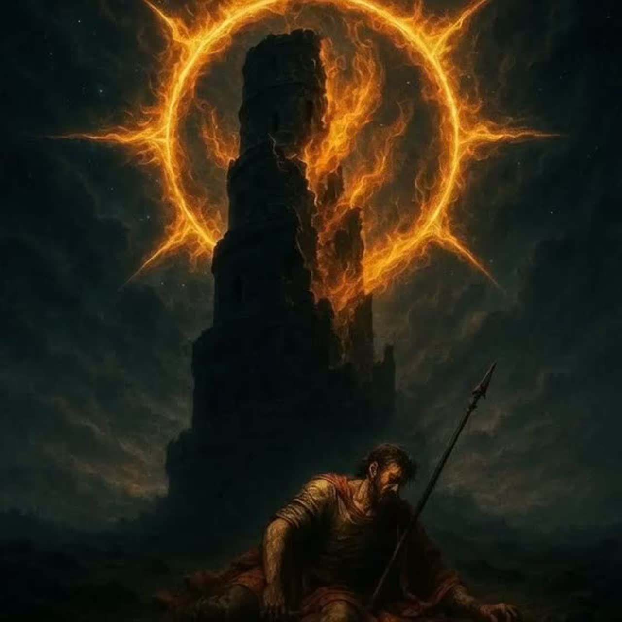 Haunting epic prog alt-metal suite, 9-12 min, slow 65-80 BPM, complex odd meters (7/8, 9/8, 11/8 polyrhythmic shifts), dynamic tribal/jazz drums sparse-to-massive, Virtuoso Hammond/Moog leads with baroque/classical flourishes & soaring highs over brooding guitars (heavy drop-tuned riffs, delay/reverb washes, bending overtones), Crushing melodic bass counterpoint, Multi-tracked male vocals: haunting brooding mid-range verses with elongated emotive vulnerability & philosophical depth, building to ethereal layered harmonies & falsetto peaks, Sparse atmospheric intros to symphonic climaxes with orchestral strings/brass swells, Ominous melancholic mood—luminous keyboard/elemental heights vs abyssal hypnotic low-end weight, Spacious arrangement, extended instrumentals, heavy reverb ethereal atmosphere