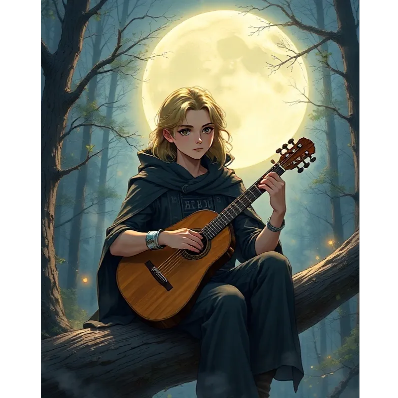 Gentle, young male voice singing a medieval healing chant, soft and calm tone, soothing melody with middle tempo, subtle reverb, deep humming background, harp and soft flute accompaniment, ancient mysterious atmosphere, minor key, emotional and warm feeling, like a bard comforting wounded travelers by moonlight