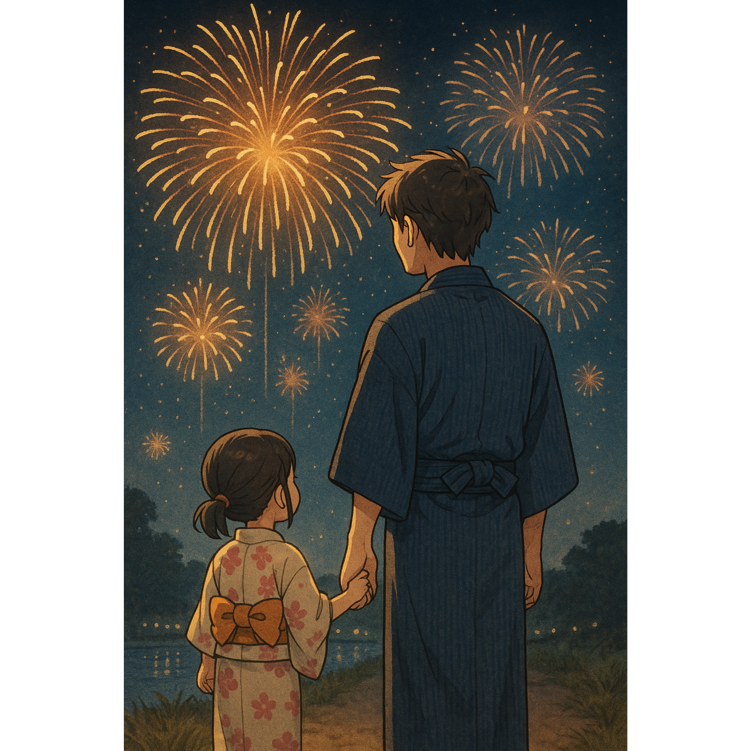 Warm, emotional J-pop band sound with sparkling electric piano, shimmering guitars, and rich pop chords, Light, syncopated drums and melodic bass support a dynamic build-up, The arrangement balances breezy summer air and heartfelt nostalgia, with twinkling textures that evoke fireworks in the night sky, Strings subtly enhance the emotional lift in the chorus, A sentimental, cinematic finale with dreamy reverb and a feeling of hope, Sophisticated, clear, and luminous