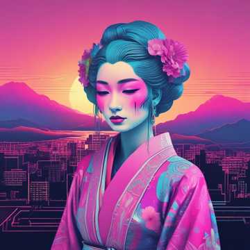 cinematic neo-k-pop, afro-trap beat switch-up, 142 bpm, F#-minor, glitchy lo-fi intro, stadium-ready chorus with supersaw synths, pitched 90-sax ad-libs, halftime drop, female & male bilingual call-response, orchestral strings riser, vinyl crackle outro Cinematic vaporwave poster: crying cyber-geisha with LED kimono, neon sakura petals glitching into pixels, holographic Fuji-san at sunset, Tokyo tower reflected in her tears, palette of hot-pink & electric-cyan, 4-K ultra-detail, emotional, viral-ready