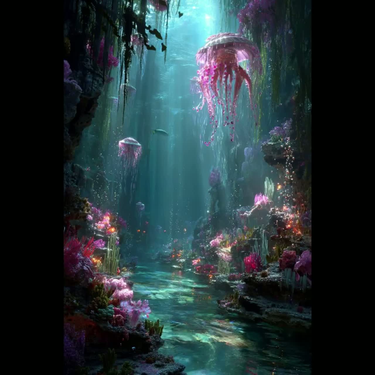 Majestic oceanic symphonic post-rock with progressive ambient layers and subtle marine pulses, Vast swelling string-like pads evoking endless coral seas, shimmering arpeggiated synth waves building like reef growth, deep resonant bass currents flowing beneath, Layered crystalline percussion: soft mallet chimes mimicking branching corals, distant whale-like sustains, gentle wave-like cymbal washes, faint bubbling reef textures, Gradual majestic dynamic rise from tranquil underwater calm to radiant expansive crescendos with soaring harmonics and shimmering high-end glow, Tempo 70-95 BPM with fluid tidal time-feel, soaring without aggression – maximum grandeur, luminous depth, constant organic expansion texture, Purely instrumental – no vocals