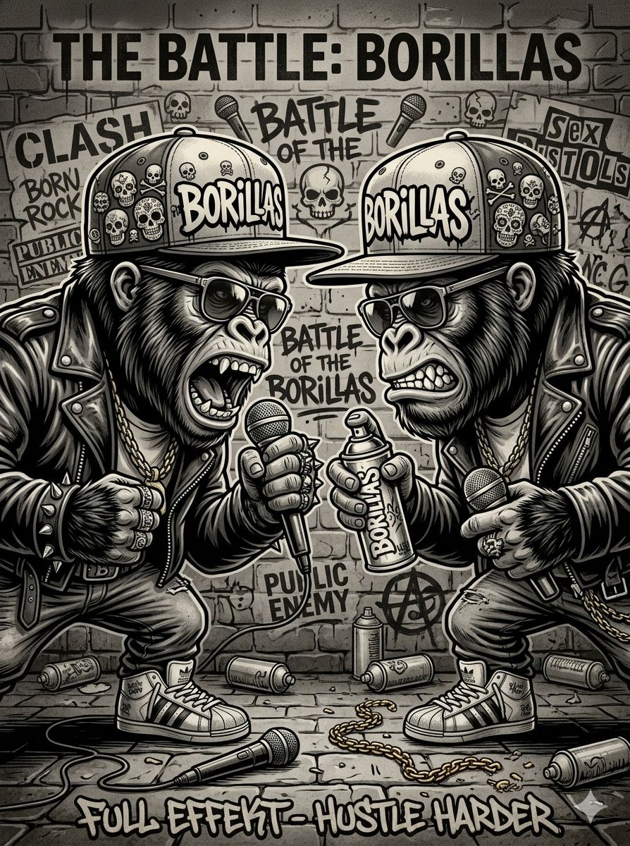 Battle rap, freestyle cypher, two vocalists facing off, aggressive delivery, call and response, underground hip hop, boom bap with trap elements, 90-95 BPM, dark gritty atmosphere, raw street energy, Spanish and English mixed lyrics, sharp punchlines, clever wordplay, intense rivalry but respectful tone, crowd reactions, hype adlibs, echo and reverb on hooks, male voices, Uruguayan street vibe inspired by Cardona and Florencio Sánchez, minimal melodic elements, heavy bass and crisp snare, dynamic flow switches, high energy, live battle feeling, powerful chorus chant, cinematic tension