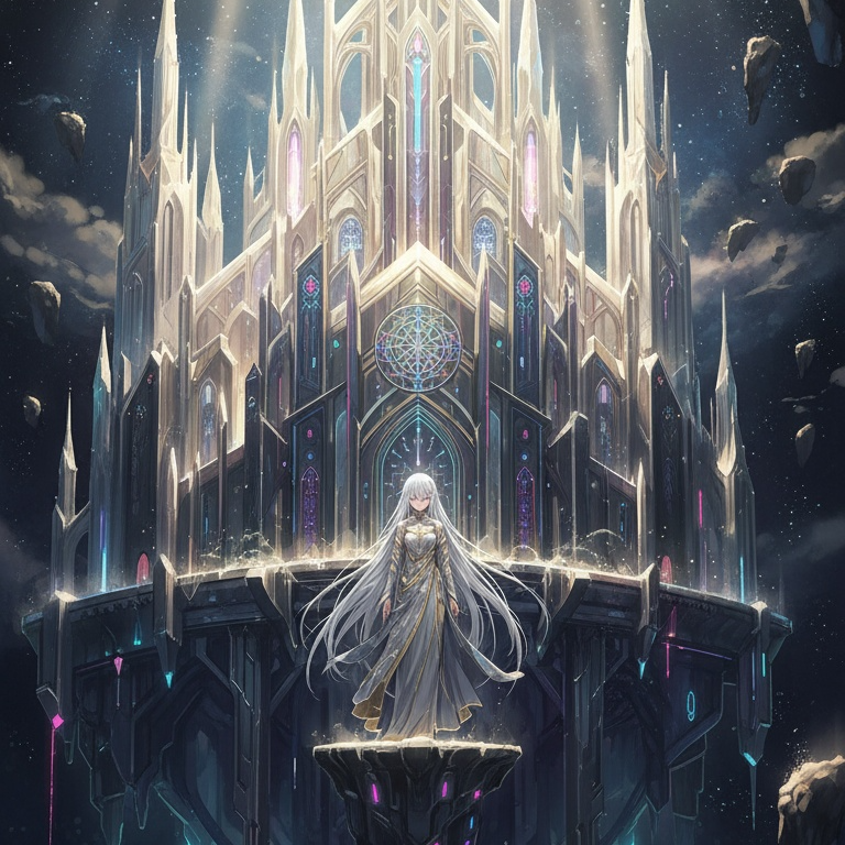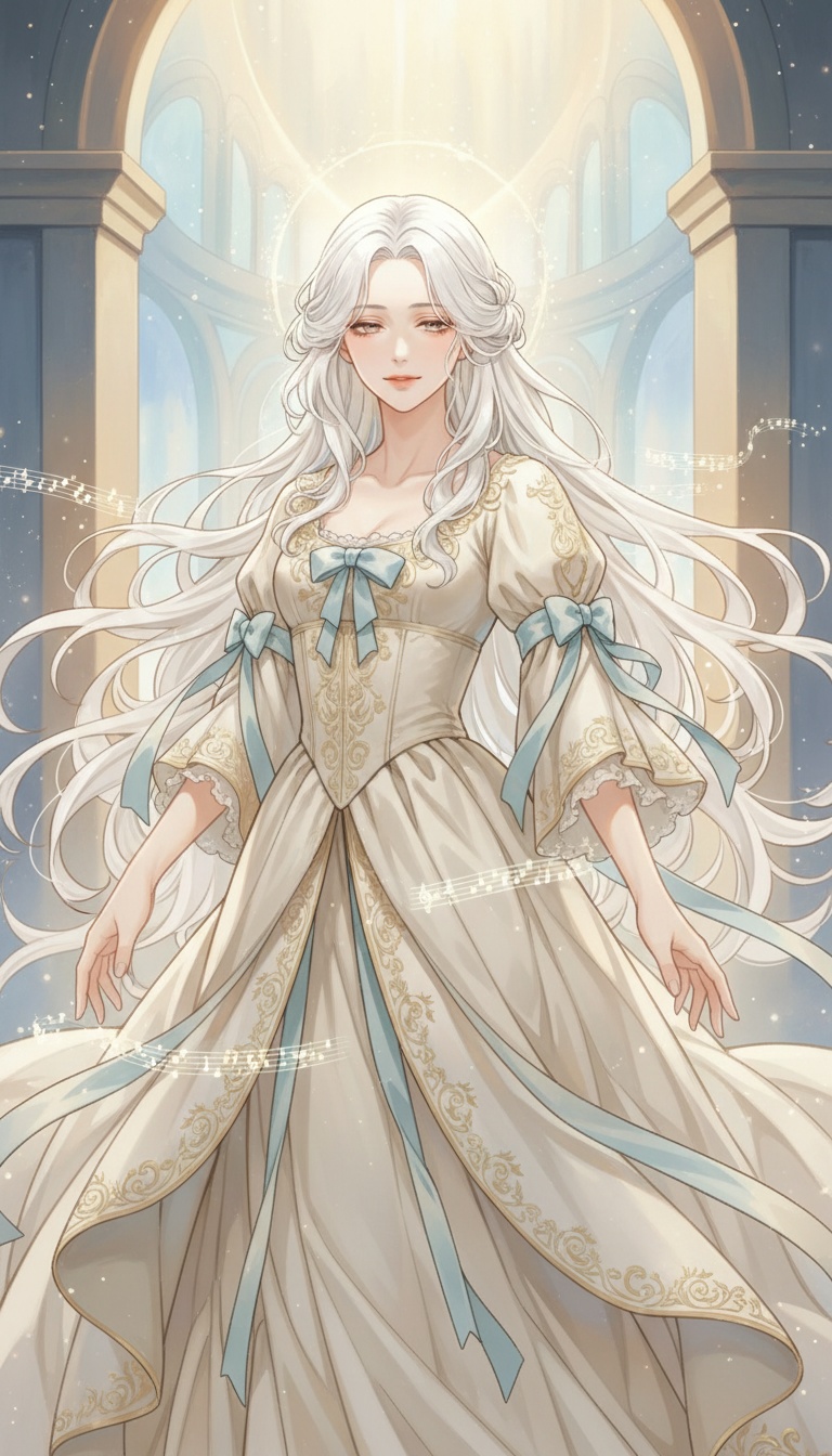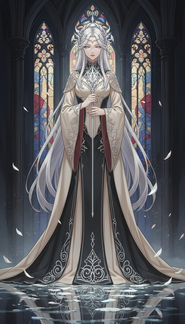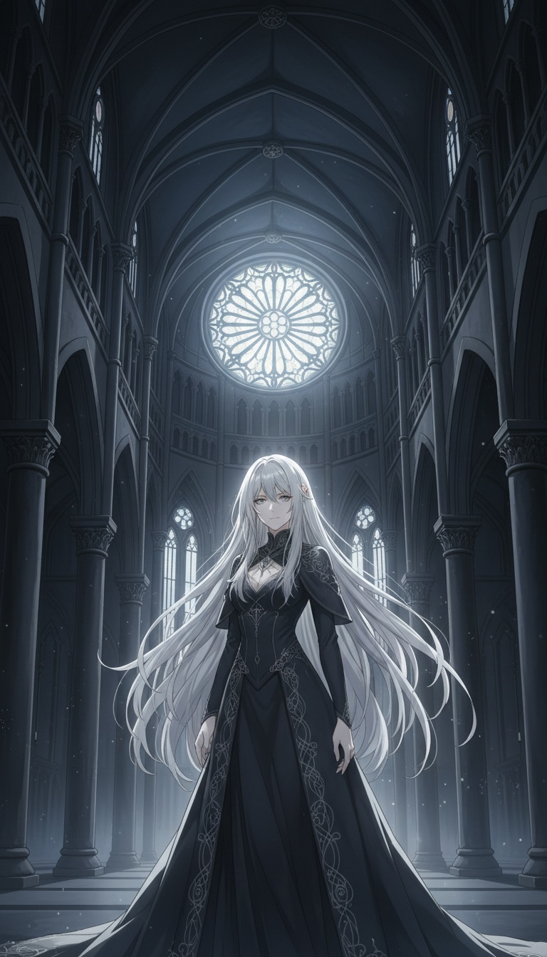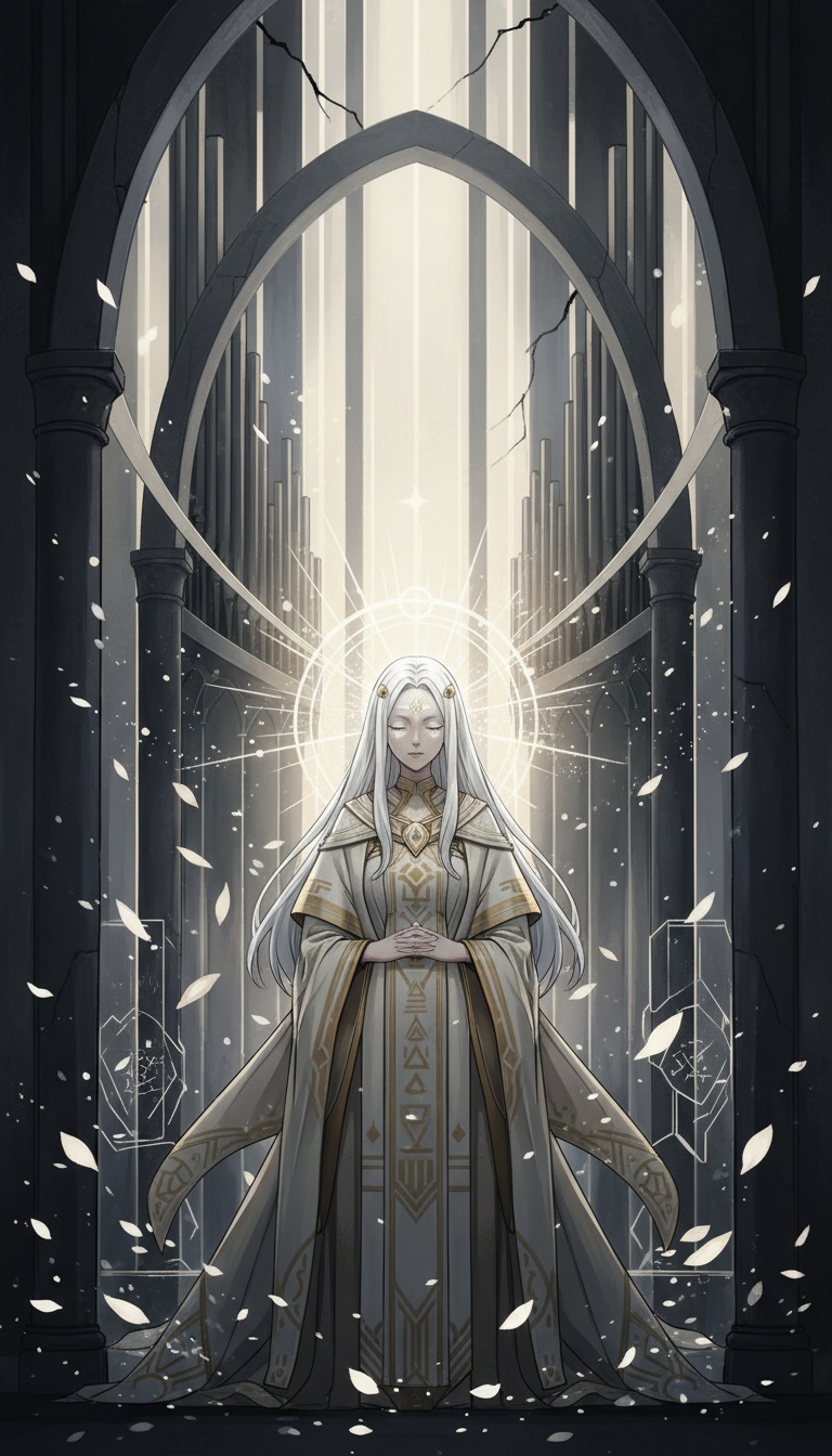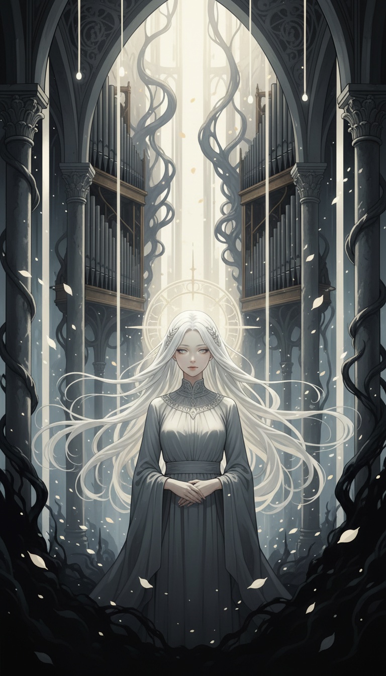 Dark symphonic metal vocal piece with sacred, operatic, and surreal fairytale qualities, Pacing emphasizes contrast between restraint and eruption rather than sustained intensity, Dominant female operatic voice with choral authority, Capable of hushed, prayer-like delivery as well as overwhelming judgement, Vocal lines alternate between intimate stillness and commanding declarations, Church organ and orchestral strings provide a cathedral-scale foundation but frequently withdraw to expose solo voice or minimal harmony, Fairytale textures such as bell tones, harp-like or celesta motifs appear in quiet moments before collapsing under heavier sections, Metal instrumentation enters selectively as consequence rather than constant force, Tension accumulates through silence, sparsity, and harmonic suspension, Dynamic shifts are intentional and dramatic, Moving from beautiful calm to merciless revelation, Overall mood remains majestic, cruelly beautiful, and theatrical