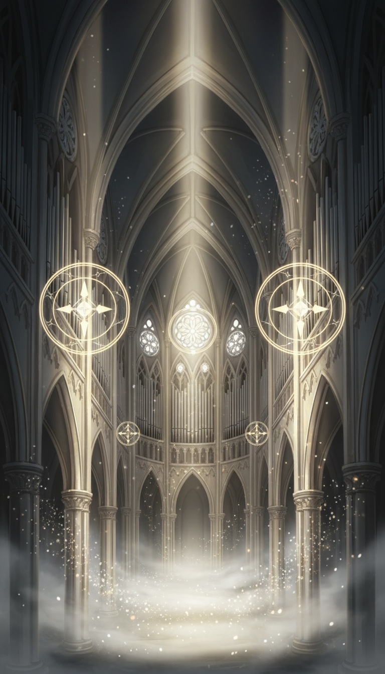 Sacred modern classical instrumental prelude, Slow tempo around 50–60 BPM, Deep pipe organ drones with gradual harmonic motion inspired by Bach chorales, Minimal string and choral textures used as atmosphere rather than melody, Focus on space, resonance, and reverberation, Dynamics build slowly and inevitably, No clear rhythmic pulse, Designed to transition seamlessly into a dramatic operatic piece, Solemn, reverent, and anticipatory mood, Light revealed before judgement