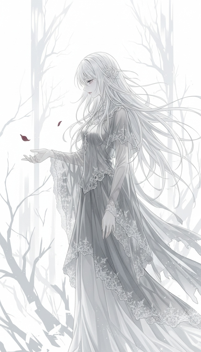 Gothic ballad reimagined through symphonic and visual-kei gothic aesthetics; slow to moderate tempo around 68–80 BPM; minor key with chromatic inflections and modal mixture; arch-shaped form with restrained opening, gradual intensification, and quiet withdrawal rather than a linear build; ritual atmosphere established by pipe organ, low strings, and sparse choir textures, blended with prominent violin lines and clean to lightly overdriven guitars; operatic female vocal remains clear and lyrical, using controlled vibrato and selective melismas, shifting between intimacy and solemn authority; melodic writing favors wide emotional leaps resolving into descending lament figures, with rubato phrasing over a steady pulse; metal elements are textural rather than aggressive, emerging briefly then receding; climax is emotionally heavy but contained, followed by reduction back to organ, strings, and silence; ending remains unresolved and suspended
