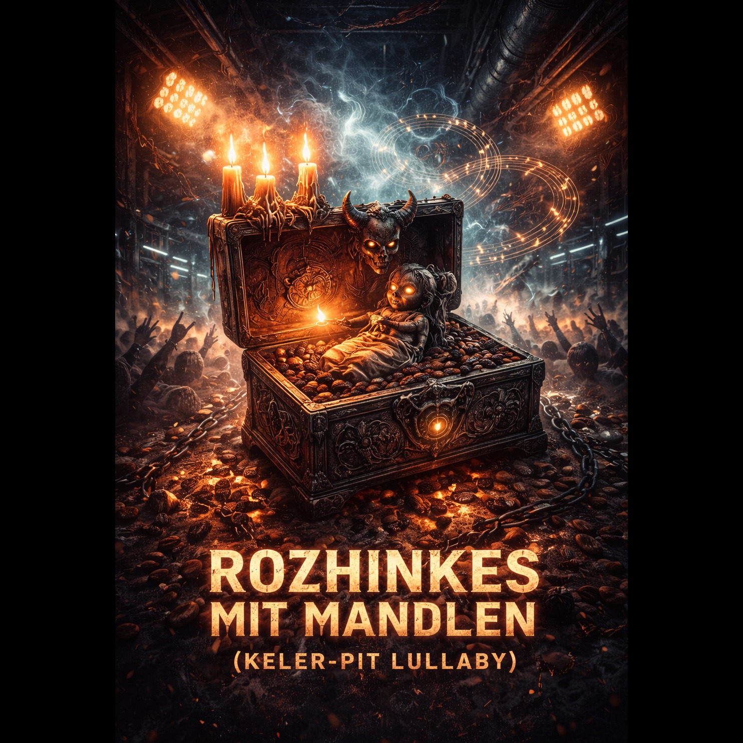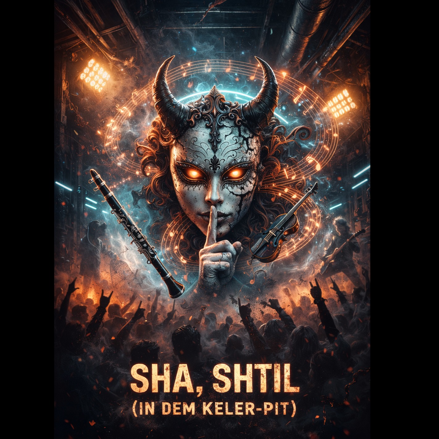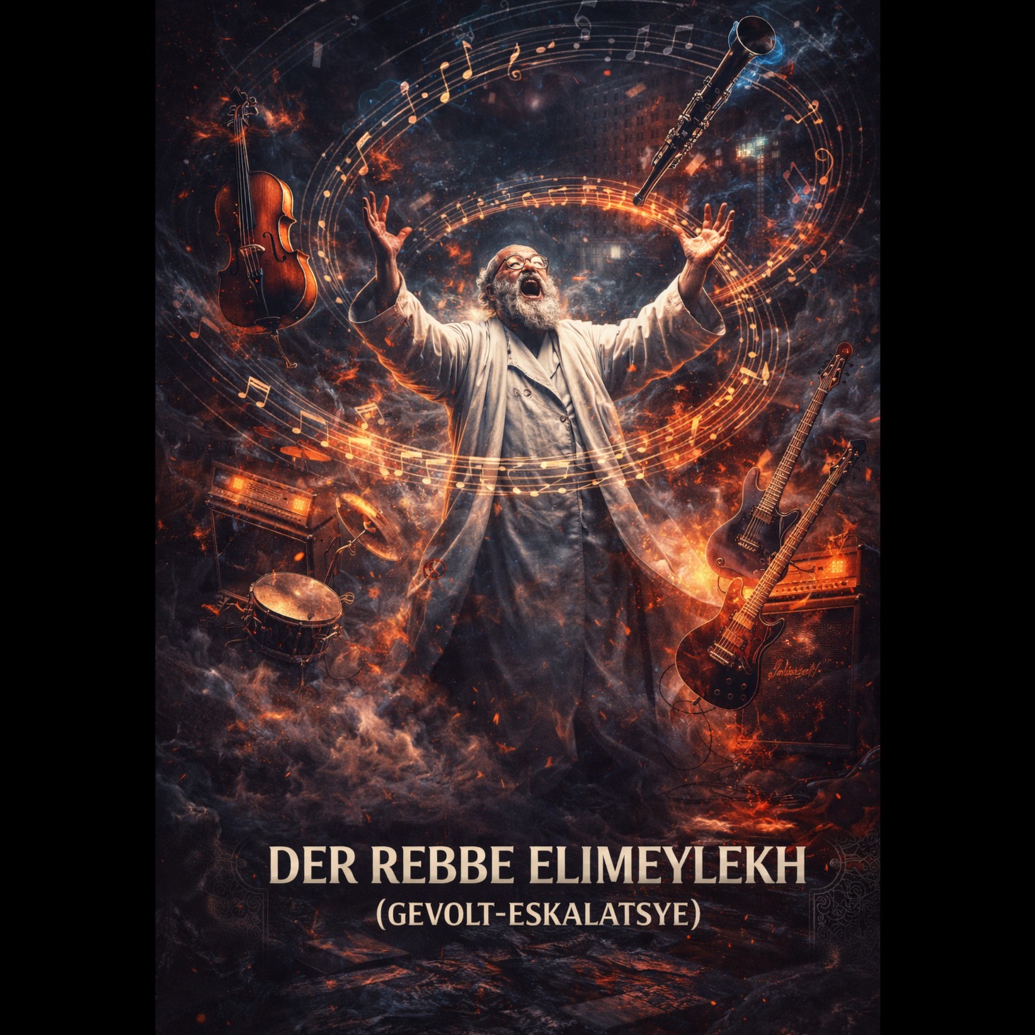Klezmer Metal / industrial folk metal, Gevolt-inspired, ultra-high energy, lullaby-to-riot arrangement, heavy distorted guitars, tight palm-muted riffs, punchy kick/snare, underground club ambience, indulgent bass clarinet, modulated fx, feral fiddle counter melody, minor-key Eastern European scales, stop-starts + breakdowns, raw DIY mix, ~170 BPM