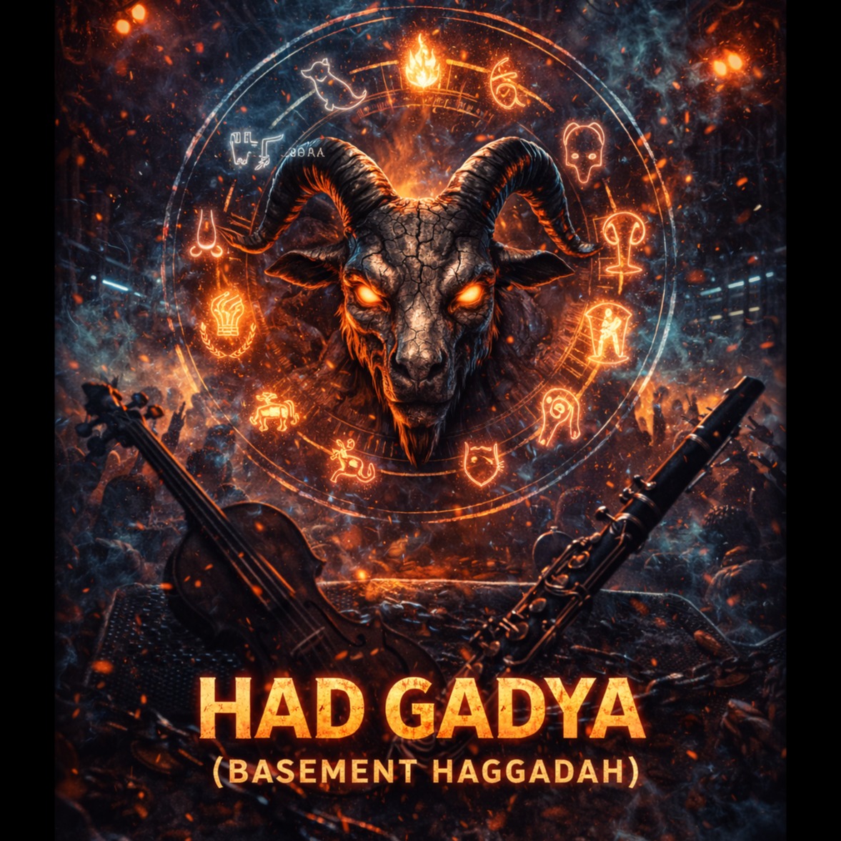 Gevolt-inspired Klezmer Metal / industrial folk metal, very high energy, stomp-groove, aggressive male vocals + gang shouts, heavy distorted guitars, tight palm-muted riffs, punchy kick/snare, underground club ambience, indulgent bass clarinet, modulated fx, feral fiddle counter melody, sudden stop-starts + breakdowns, raw DIY mix, ~170 BPM