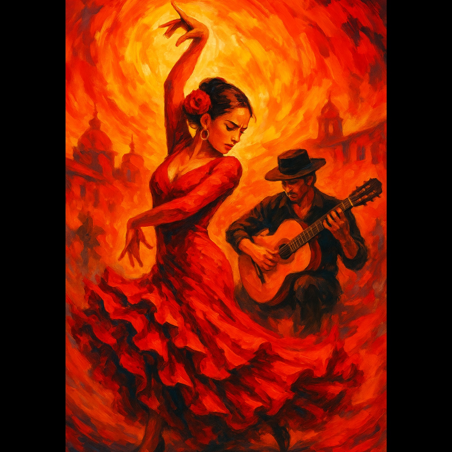 A fiery, passionate Latin-Spanish instrumental track starting with a sharp, energetic Spanish guitar intro, No slow build-up — the music starts immediately with intensity, The style should evoke a dramatic and sensual dance, like flamenco or tango, with a blend of aggression and beauty, Emphasize expressive melodies and strong rhythm, Feature a powerful Spanish guitar solo with emotional phrasing, rich harmonies, and vibrant dynamics, The overall mood should be bold, seductive, and full of raw passion