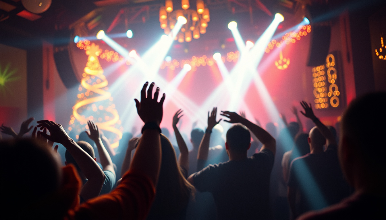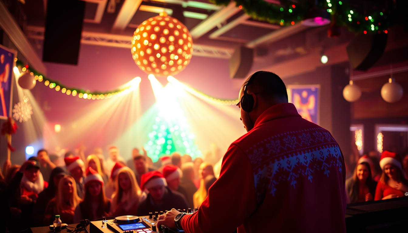 High-energy festival EDM Christmas track, big room style, heavy bass, punchy kick, sidechained synths, bright bells, simple chant vocals, massive drop, radio-ready, club anthem