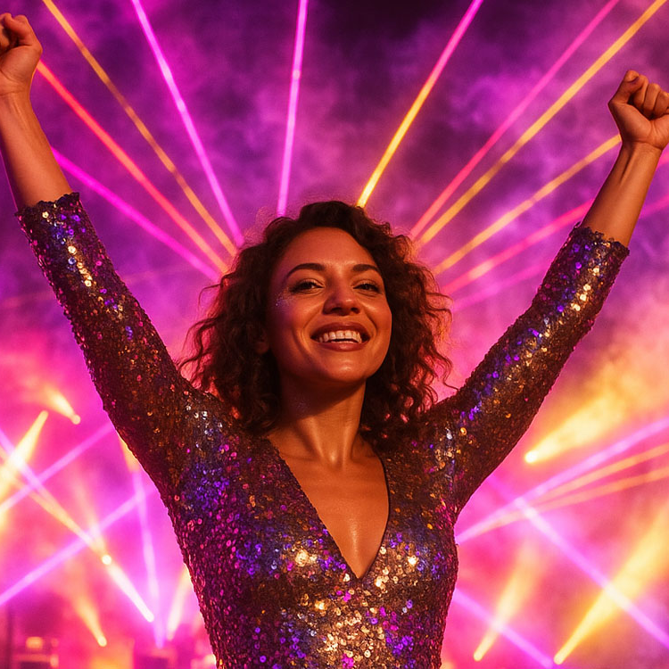 Disco EDM, Pop Anthem, Confident, energetic female vocal with smooth disco phrasing in verses and powerful belting in chorus; airy ad-libs on the drop, Four-on-the-floor drums, funky bass guitar, disco guitar, brass stabs, bright synth leads, strings, handclaps, EDM build-ups and drops, Euphoric, liberating, party, uplifting