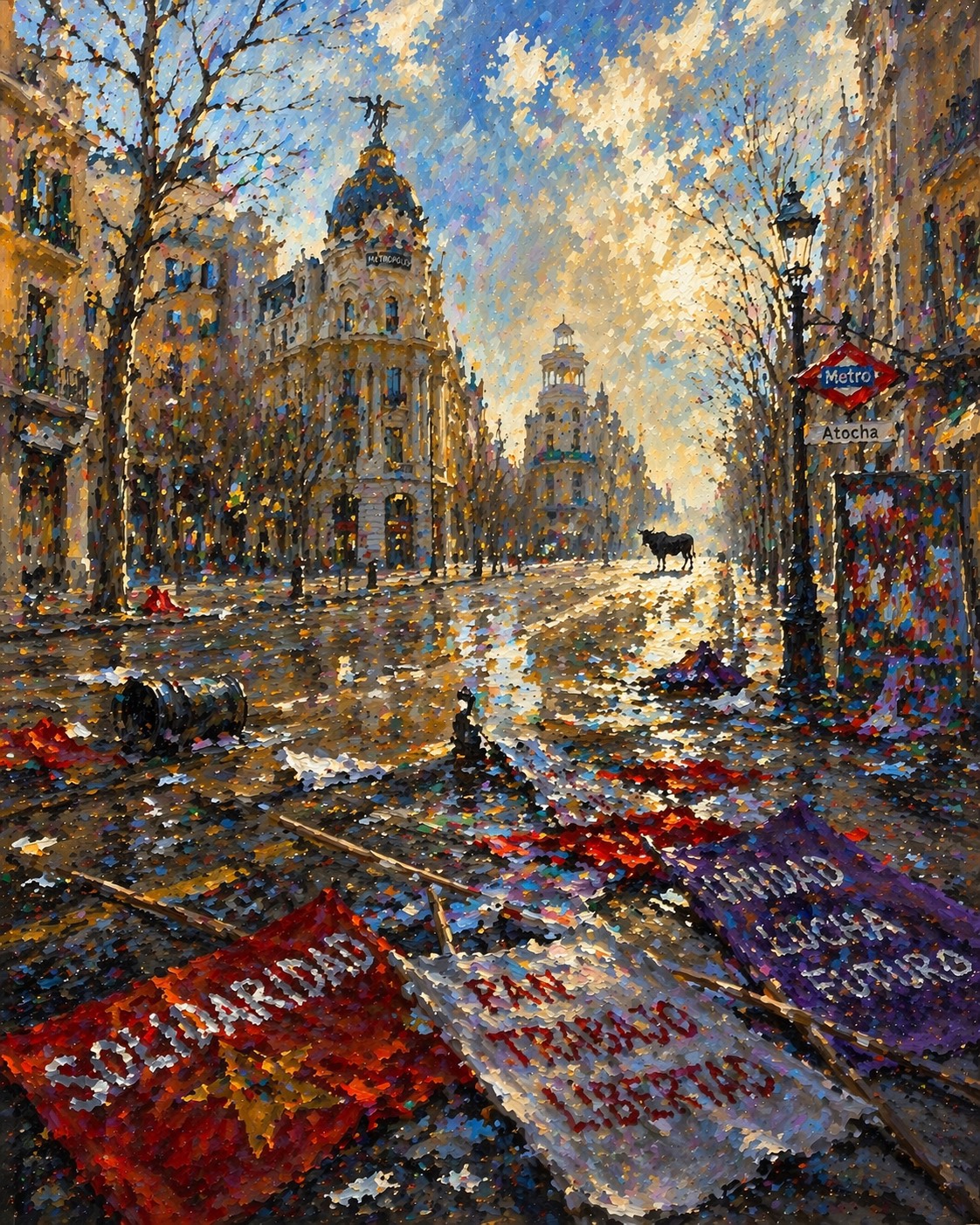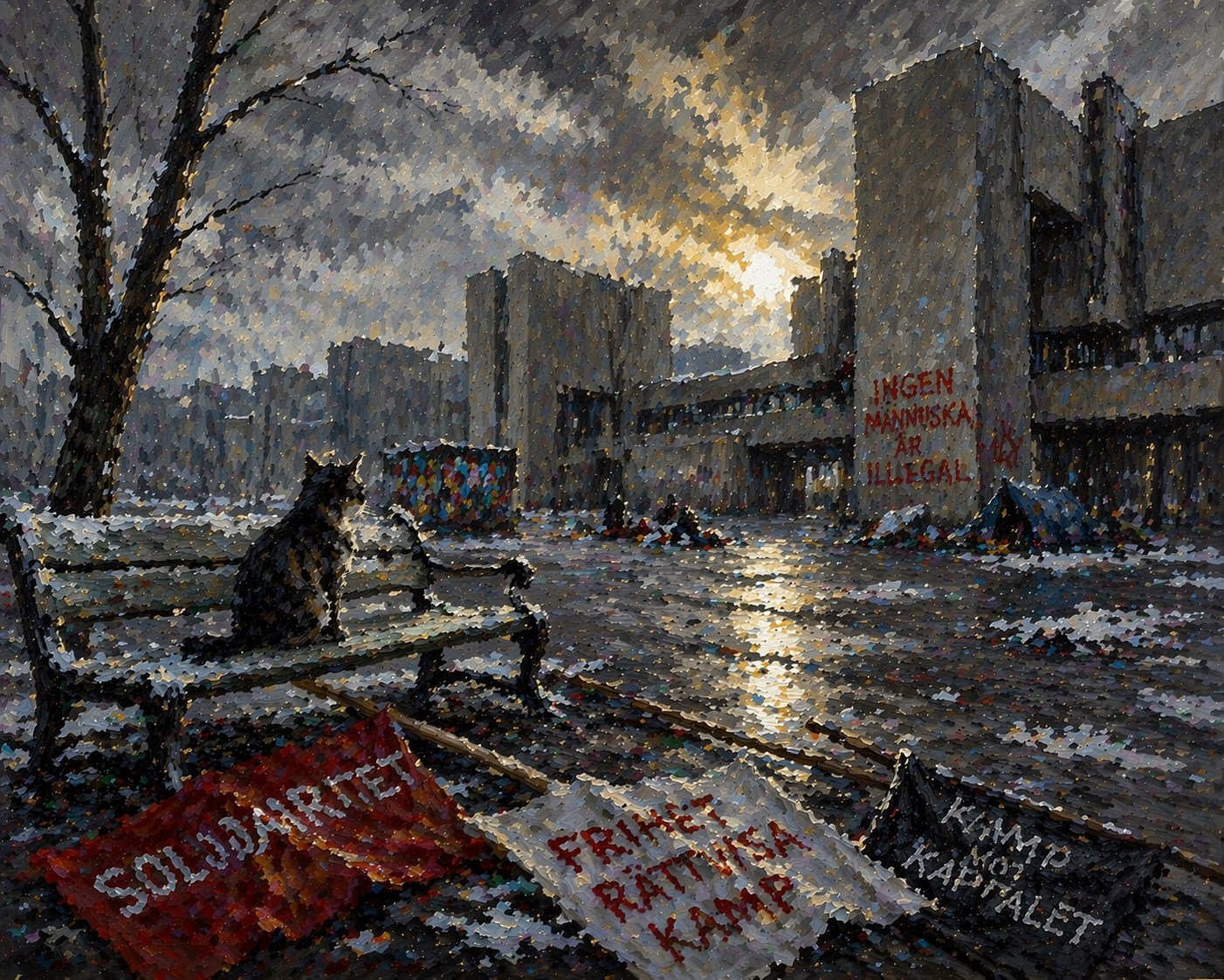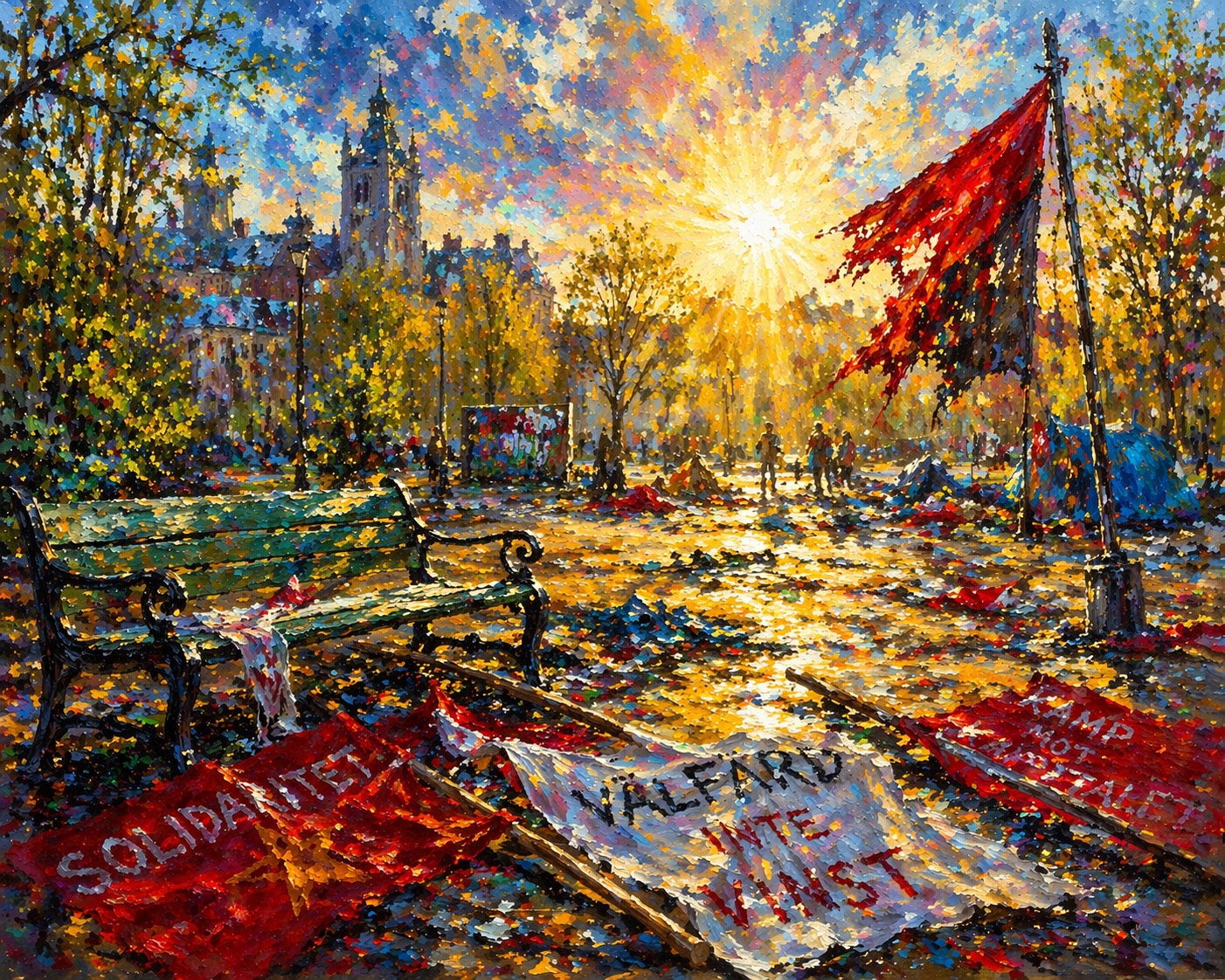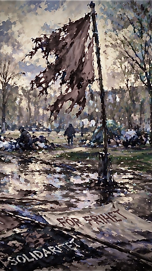 Grit-heavy acoustic folk in 3/4 with a rough, smoker's baritone lead pushed aggressively forward, close-mic breath and gravel emphasized, The vocal carries cracked edges, heavy chest tone, and worn, late-night phrasing, like a protest singer at closing time, Steel-string acoustic guitar drives a raw waltz groove with harder-struck bass notes, occasional rasgueado bursts, dissonant hammer-ons, and scraped slides for texture, Added variation through subtle tempo pushes and pulls, whispered backing phrases, and low, humming vocal doubles in key lines, Production is saturated and tape-worn with gritty midrange, roomy club ambience, and occasional overloaded transients that give a live, on-the-brink energy