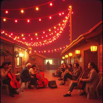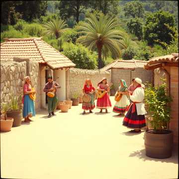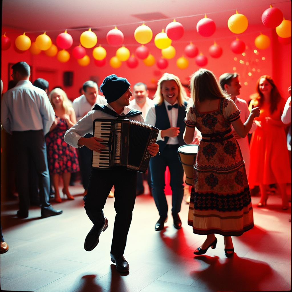 Musica da festa etno-balcanica con strumenti popolari rumeni (cimbalom, fisarmonica, flauto nai) mescolati con zingara moderna, ritmo di danza, coro maschile che grida linee orecchiabili, battiti di mani e violini, Tema: un matrimonio di paese o una festa estiva, Usa strumenti tradizionali come nai, violino, fisarmonica e cimbalom, Il t, archi dell'orchestra, stil maramures, lautareasca, burlesque