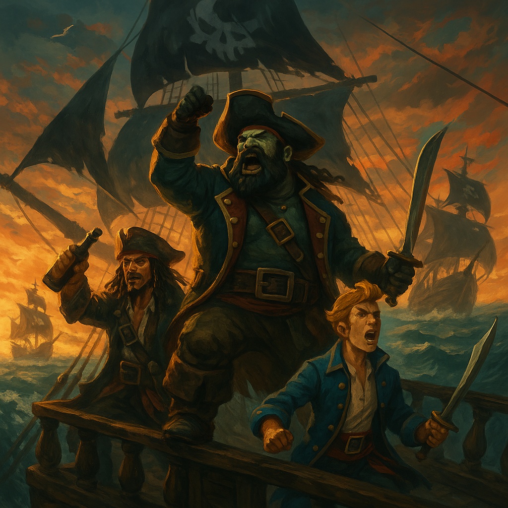Electric guitars with sea-shanty riffs, Fiddle & accordion layers, Deep tom drums for cannon-blast feel, Thundercrack samples, Male Vocals, Pirate, female chorus