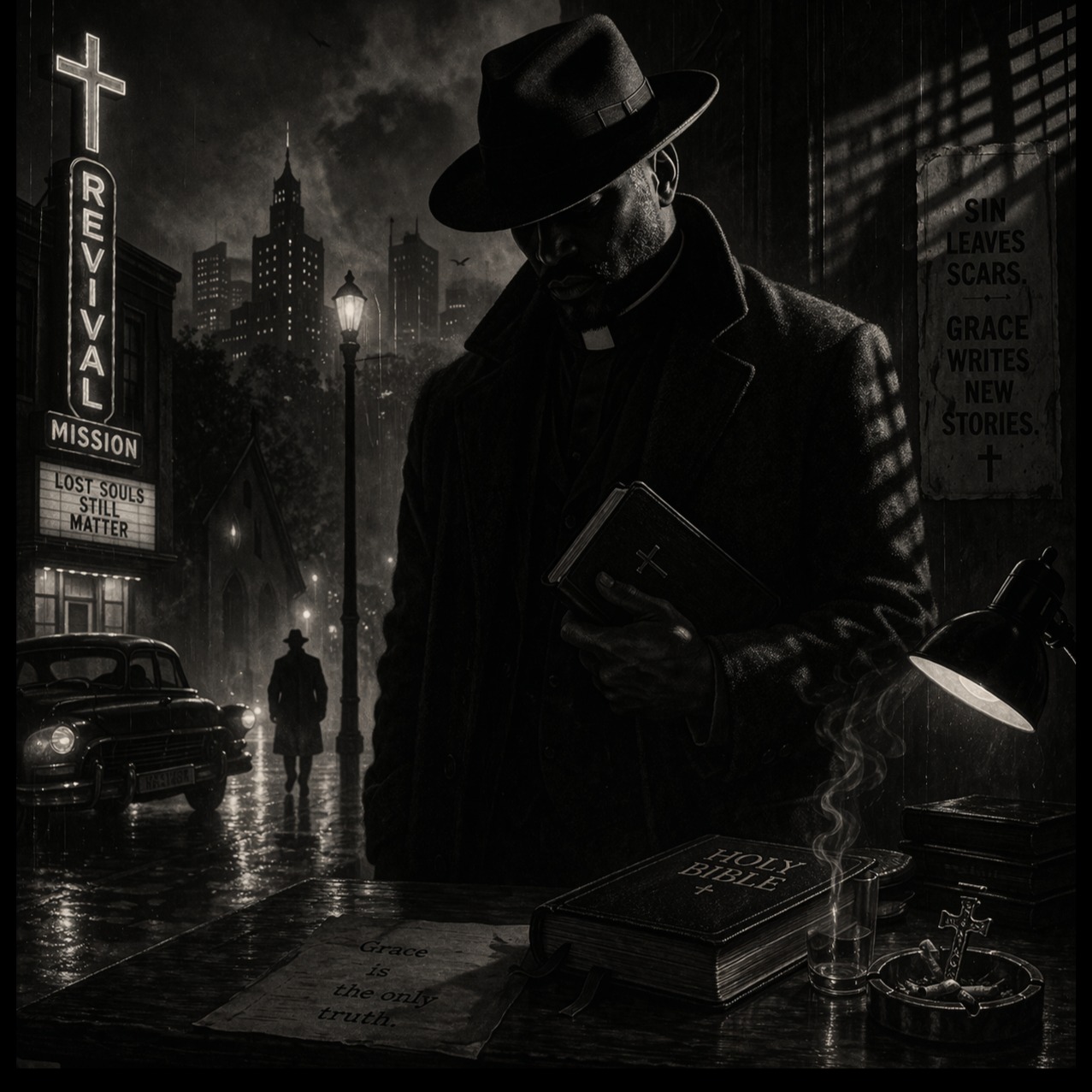 Gospel-noir jazz with cinematic soul and spiritual drama: soft felt piano, brushed drums, upright bass, muted trumpet, and a crying tenor sax through plate reverb, Hammond organ pads, trembling string ensemble, choir swells, and slow-burn dynamics create a smoky, reverent, late-night tension with deep emotional lift