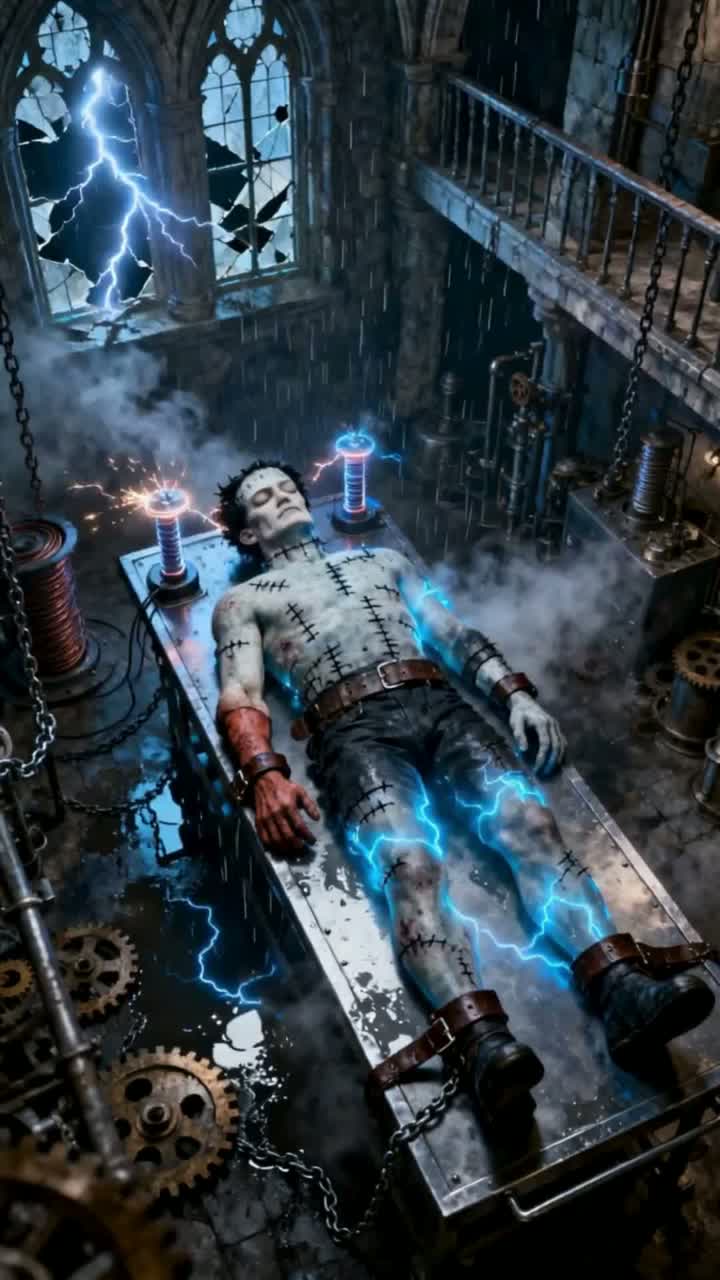 Dark rap/trap track with deep male vocals, precise and cunning beat, Atmosphere is cold, electric, and trance-like, with swirling pads and subtle reverb, Heavy sub-bass pulses hit at key moments, balanced with steady mid-bass, Trap-style hi-hats and tight percussion add sharpness, but space is left for the vocals to dominate, Vocals are low, menacing, layered with faint echoes and whispers for a Frankenstein-monster effect, Background textures include metallic clanks, static zaps, and cinematic ambience to suggest a machine awakening, Structure builds from eerie ambient intro into dark verses with minimal beat, expands into heavy bass + trance pad chorus with a haunting chant of “Arise Frankenstein, ” then fades back into mechanical silence