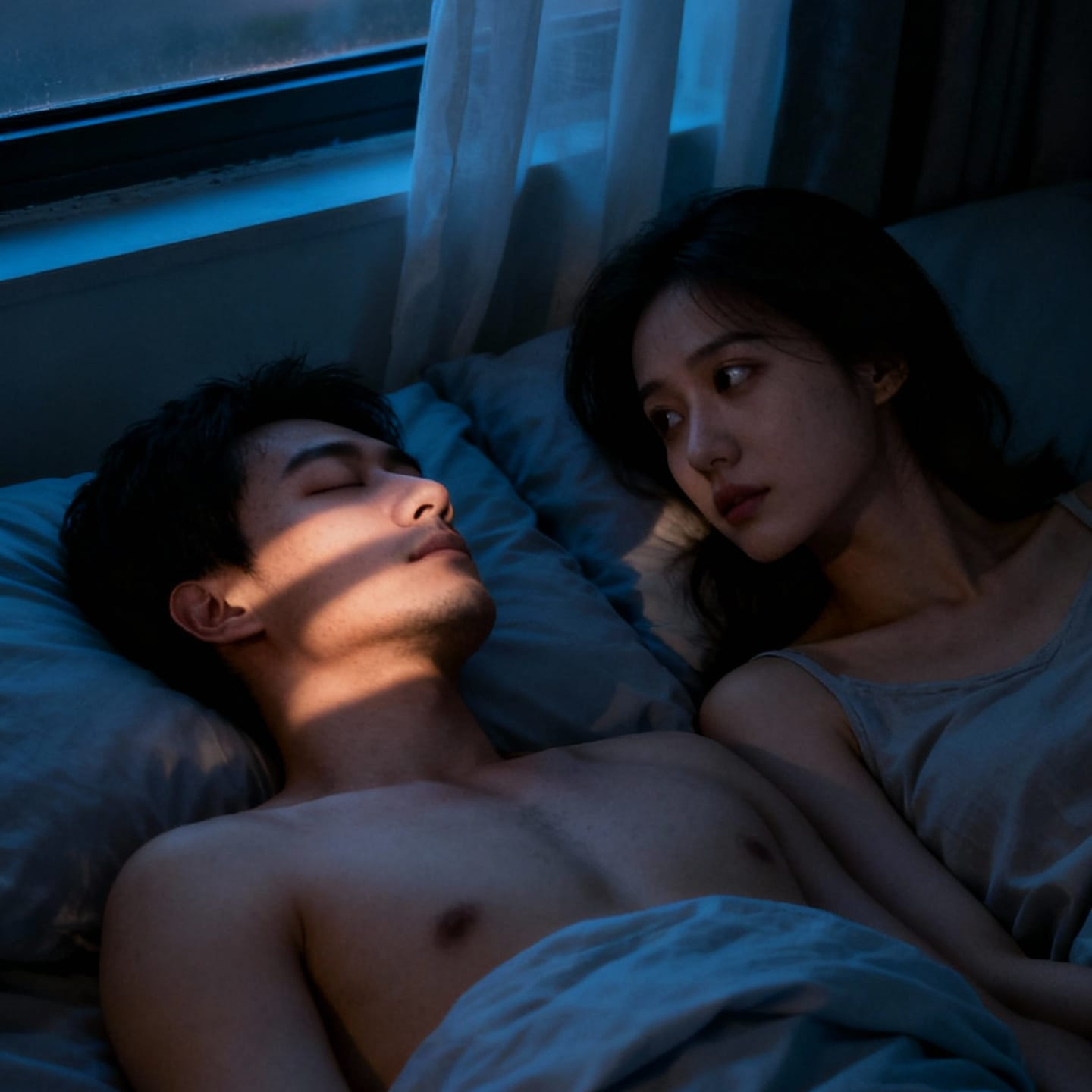 Cinematic ambient trip-hop ballad at 66 BPM in B minor, British female vocal — soft, breathy, and intimate, performing with emotional restraint, Minimalist piano, muted cello, and ambient pads create a delicate nocturnal space, underscored by soft trip-hop percussion and sub-bass warmth, The story unfolds in a quiet bedroom at night, where the singer lies beside her partner but drifts into memories of another love, Verses are confessional and reflective; the bridge glows with bittersweet warmth; the final chorus fades into calm acceptance, A cinematic study of intimacy, distance, and the ache of remembrance — where love lingers quietly, and only the silence knows