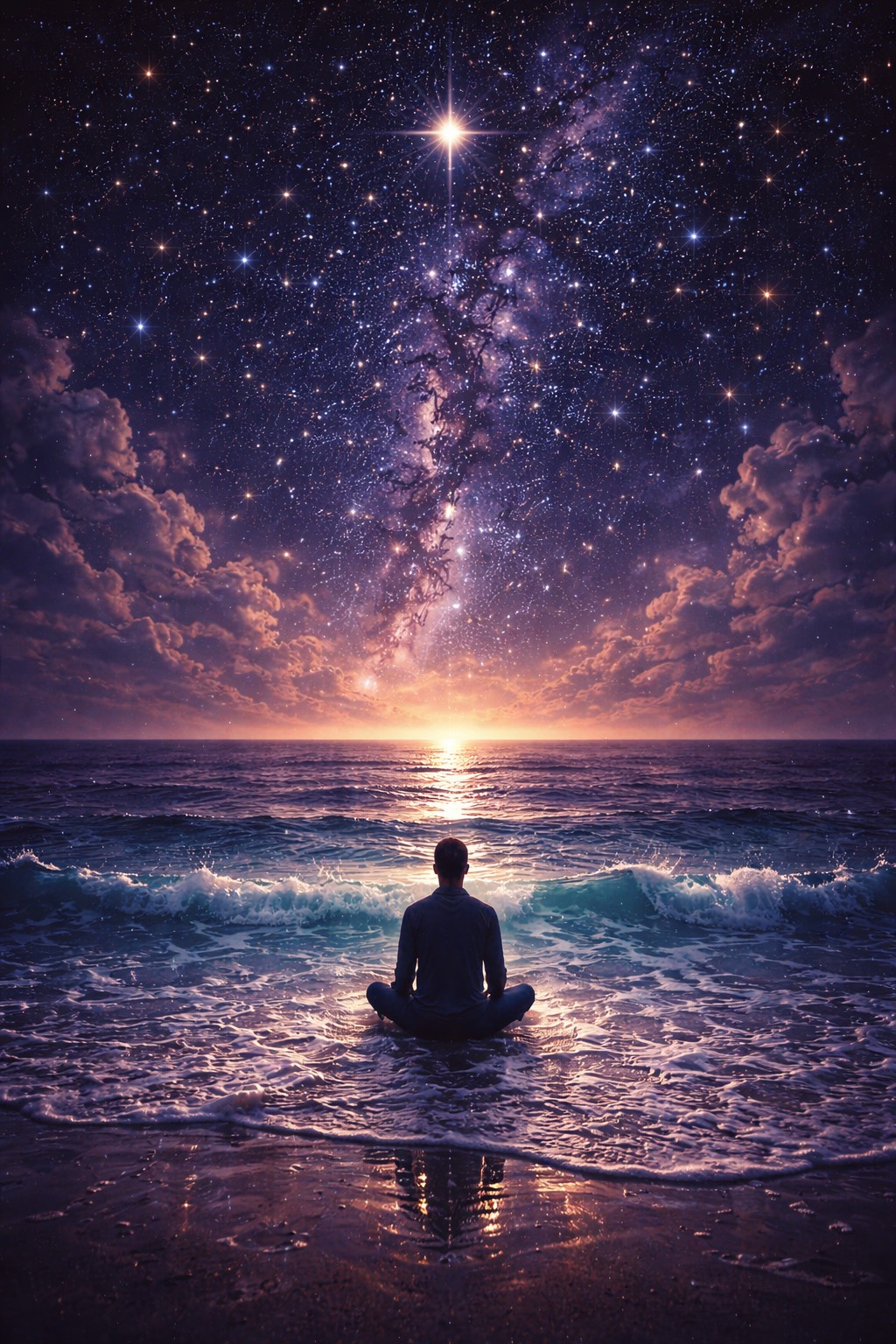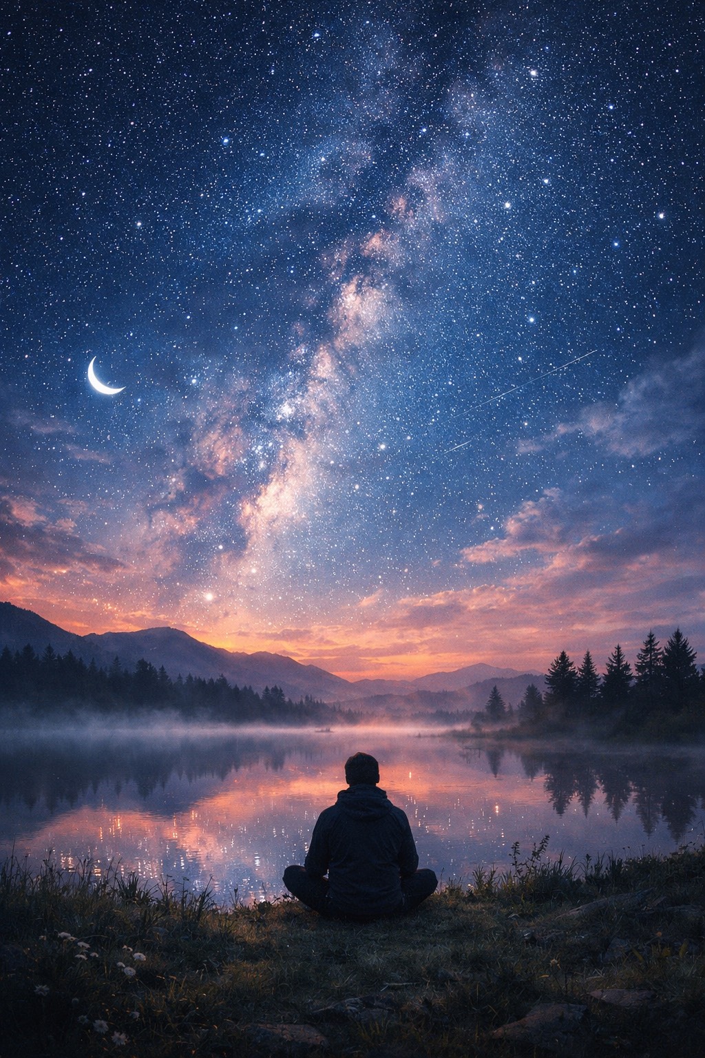Genre: Indie Folk, Subgenre: Gentle folk ballad, Mood: reflective, peaceful, tender, luminous, Theme: human life as a brief, sacred expression of the cosmos, with love and memory giving meaning to passing time, POV: first person plural, intimate and universal, Setting: a quiet nighttime landscape turning toward dawn, Hook line: “For a moment in eternity, the stars learned how to sing, ” Vocal type: soft lead with warm close harmonies, Language: English, Tempo vibe range: slow, 68-82 BPM, Key: D major or B minor, Instrument focus: fingerpicked acoustic guitar, warm piano, faint strings, soft ambient swells, Mix cues: airy stereo space, gentle low end, natural dynamics, clear vocal intimacy, polished closing-track glow, Era feel: modern indie folk with timeless warmth, Energy level: low to medium, rising in the bridge to an emotional final chorus, Keep verses story-rich and fluid with loose ABCB echoes, a recurring chorus motif, a bridge that blooms as the crescendo, and a hushed memorabl