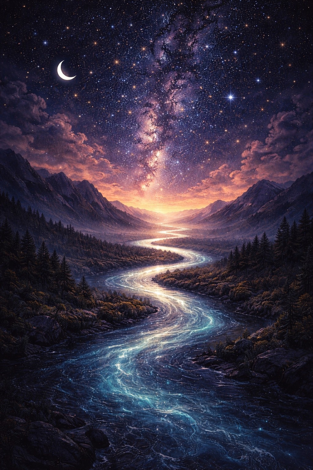 Indie folk, psychedelic folk, contemplative and mystical, a spiritual journey from striving and separation into surrender and belonging, first-person POV in mountains, valleys, canyon, river, and open sky, Hook line: “I am the river that forgot its name, ” Warm, intimate lead vocal with airy mixed-gender harmonies, English, Slow to mid tempo flow, around 72 to 88 BPM, model chooses BPM, Optional key: D major or B minor, Fingerpicked acoustic guitar up front, soft upright bass, brushed drums, light piano, subtle analog pad, echoing electric guitar swells, and ambient textures in the bridge, Spacious reverb, wide stereo air, punchy but gentle low end, polished organic mix, modern indie-folk with a timeless 70s pastoral haze, Start hushed, build steadily, let the chorus motif recur clearly, make the bridge the emotional crescendo, then open into a bigger final chorus and a floating, resolving outro, Favor natural singable phrasing with loose rhyme, near rhymes, and internal echoes