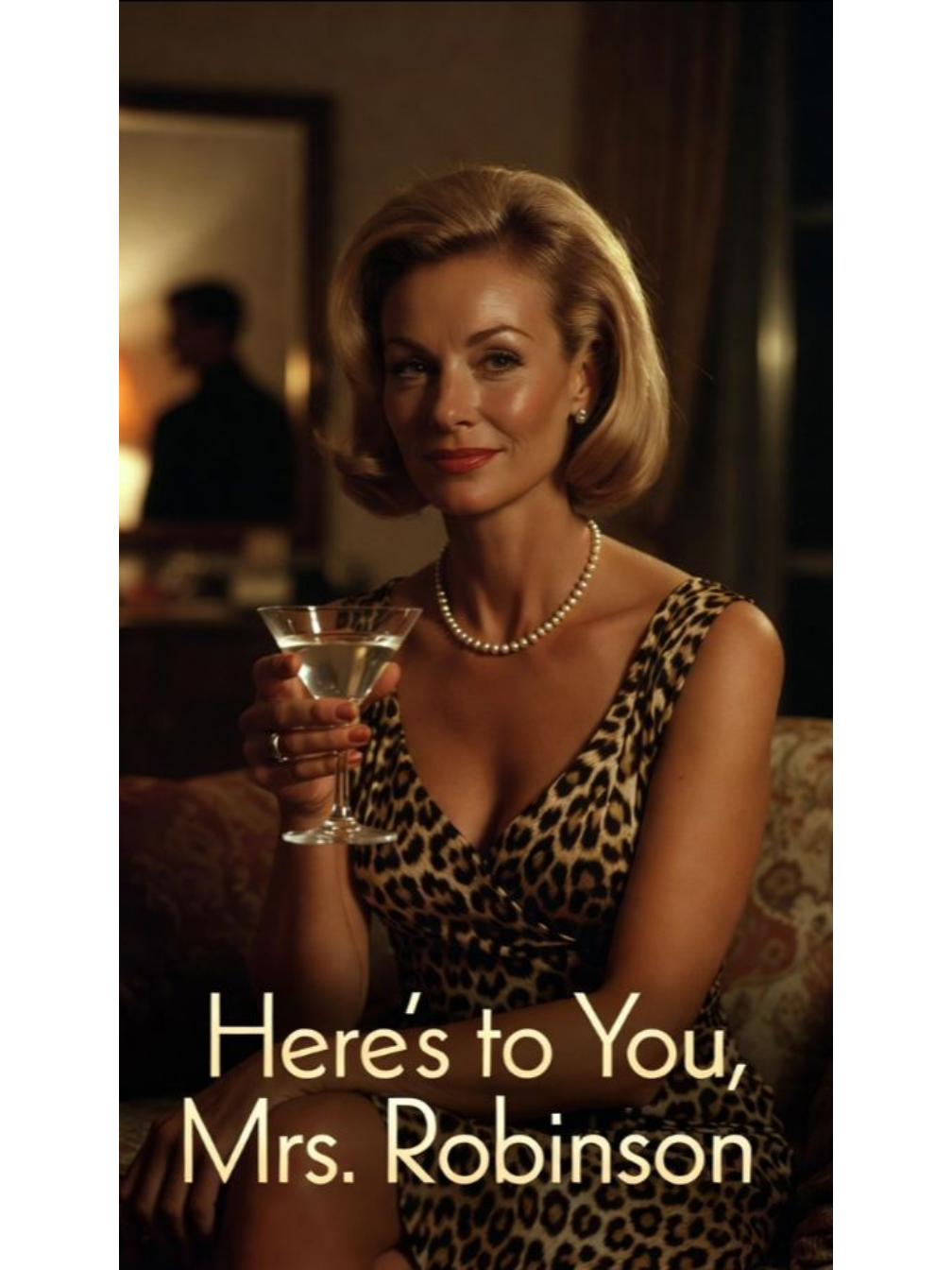 smooth seductive 60s folk-rock with sultry breathy female vocals, warm acoustic guitars, gentle percussion, subtle Hammond organ, light basslines, intimate sophisticated production evoking The Graduate soundtrack era, confident playful storytelling from Mrs, Robinson's perspective, direct spoken intro, no melodic vocal start, precise vocal delivery from lyrics, do not change any words inside brackets, sing exactly as written, ultra-clean production, pristine high-fidelity mastering, flawless crystal-clear mix, audiophile reference quality, absolutely no distortion, no hiss, no crackle, no background noise of any kind, no artifacts, no static, no tape hiss, no vinyl crackle, no digital glitches, ‑male vocals, ‑fast tempo, ‑clean pop, ‑innocent vibe, ‑acoustic instruments, ‑country, ‑jazz, ‑lo-fi chill, ‑bright pads, ‑shy delivery, ‑background noise, ‑static, ‑hiss, ‑shimmer, ‑clicks, ‑pops, ‑floor noise, ‑distortion, ‑artifacts, ‑tape hiss, ‑vinyl crackle, ‑digital glitches, ‑low fidelity, ‑muddy mix, ‑unwanted reverb, ‑breathing noise, ‑intro humming, ‑oh oh ah ah, ‑melodic ad-libs, ‑vocalizations at start, ‑unnecessary scats