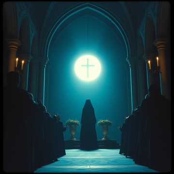 Orchestral Symphonic Black Metal, D minor, catchy chorus sung, verse spoken, recited poetry, dark clear voice, choir, orchestral instrumental, ritualistic, black mass, melancholic, melodramatic, tragic, sadness, incantation, hypnotic, ‑happy, ‑pop, ‑djent, ‑mainstream, ‑radio-friendly, ‑commercial