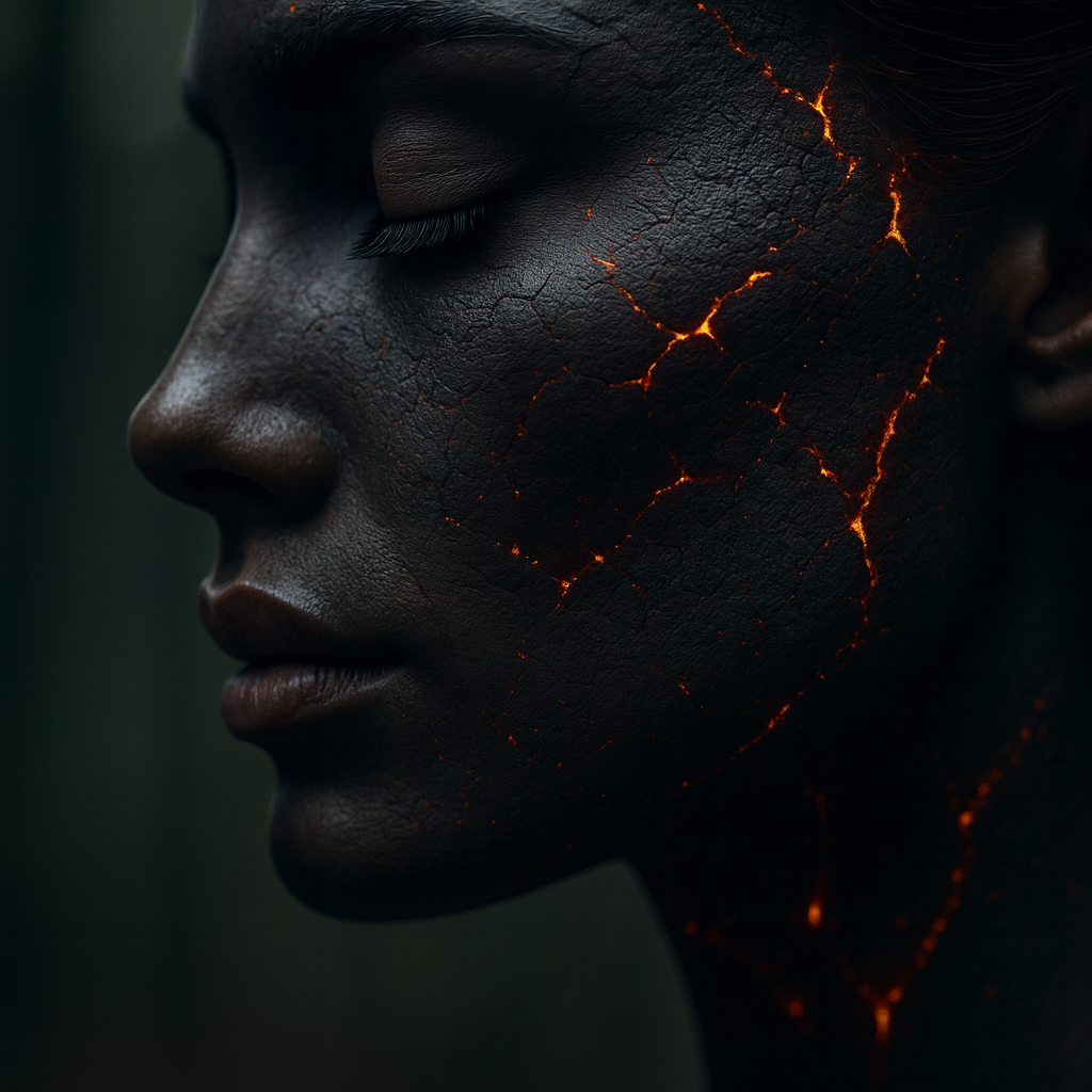 Visual Atmosphere: cracked mirrors, scorched wings, lightning-veins, ash-breath, alien bloom under ruin skies