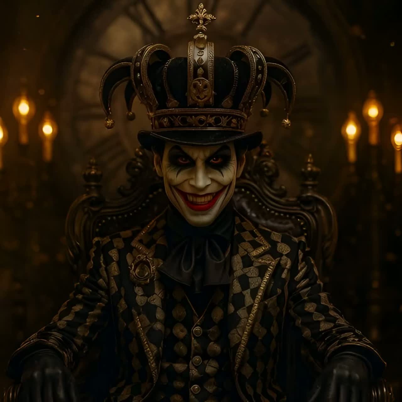 Atmosphere: grotesque carnival ruins, fractured mirrors, spotlight crown, ash confetti rain