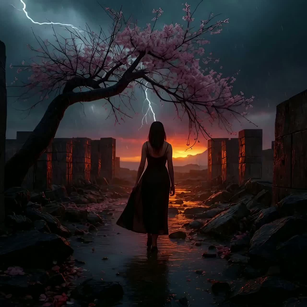 Visual Atmosphere: petals in stormlight, rain-washed ruins, echoing heartbeat, fractured dawn sky, dawn bloom renewal