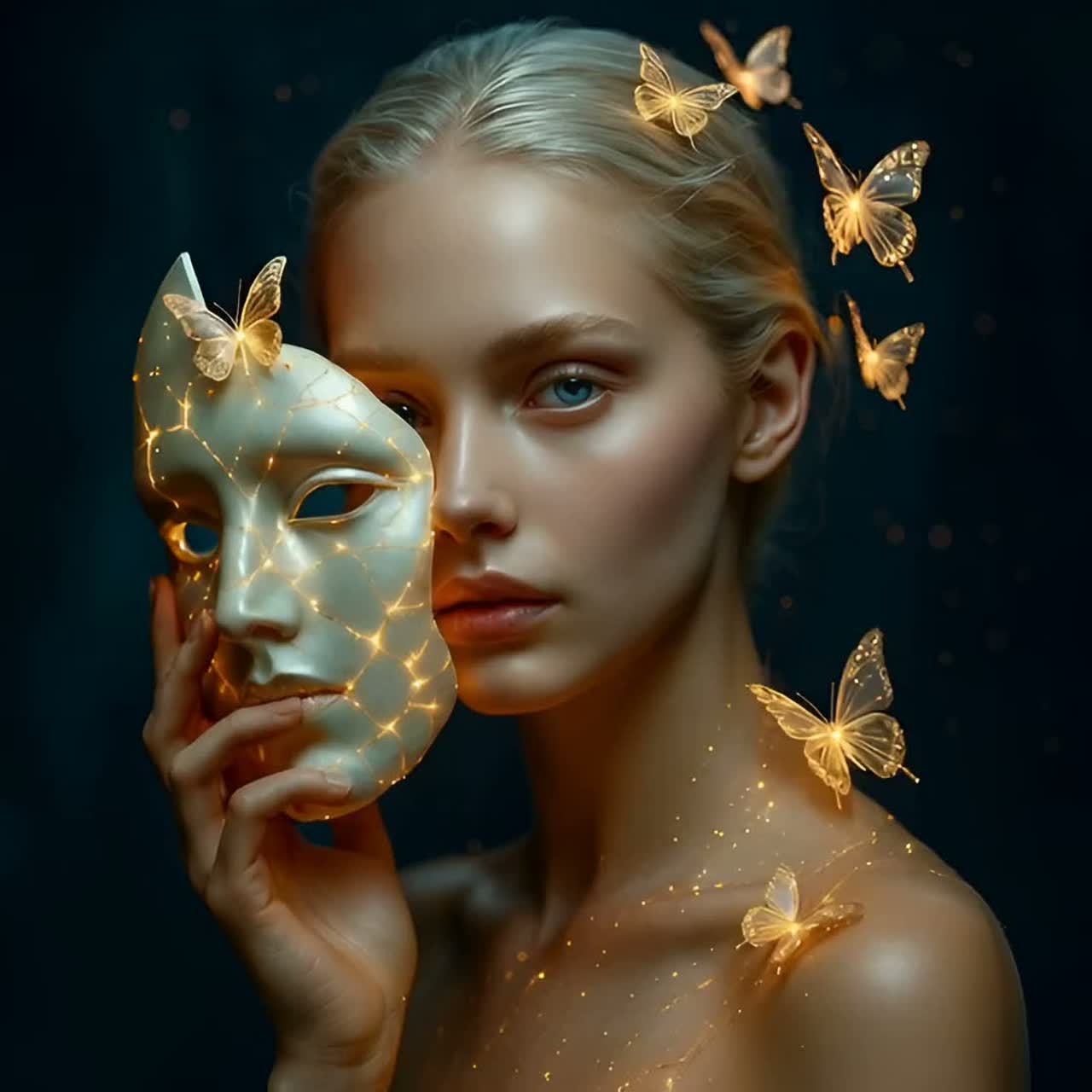 Layering: Metallic impact bed, shimmer bloom accents, dual-persona contrast