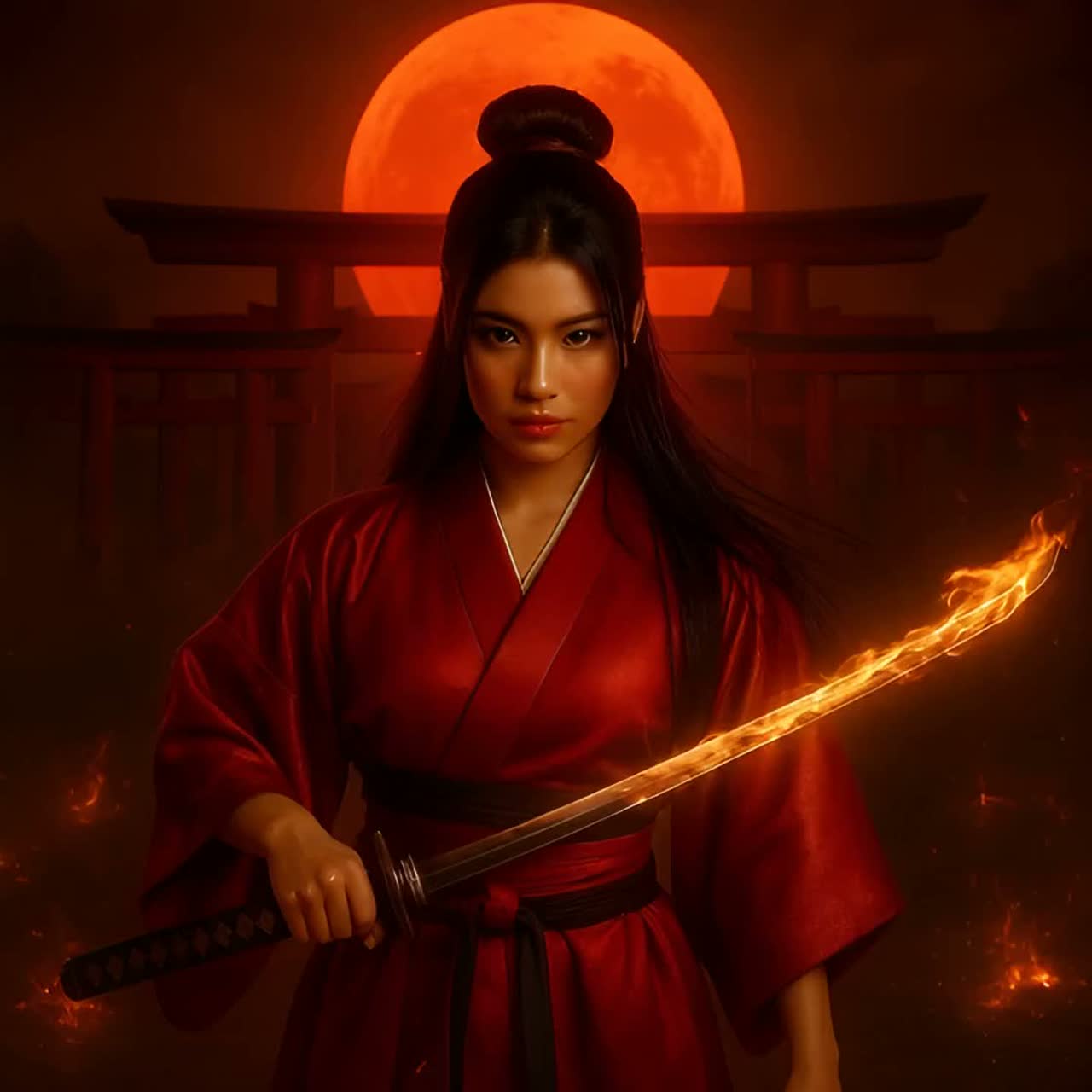 Visual Atmosphere: blood moon battlefield, ancestral chants in ash, warrior reborn in flame