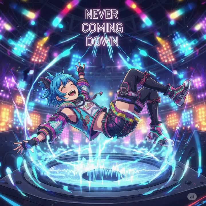 pulsating beats at breakneck speeds, driven by a powerful, thumping kick, Euphoric, synth-heavy melodies intertwine with high pitched anime female vocals delivering catchy, feel-good lyrics, It's high-energy, rave-ready electronic music designed to make you jump and smile, with a distinct blend of hard dance aggression and uplifting pop sensibilities, vibrant, digital soundscapes, high-energy, often vocal-driven, happy hardcore and UK hard dance music, characterized by fast tempos, uplifting melodies, catchy high pitched anime female vocals, and prominent kick drums, Lyrical themes frequently revolve around internet culture, video games, and positive vibes