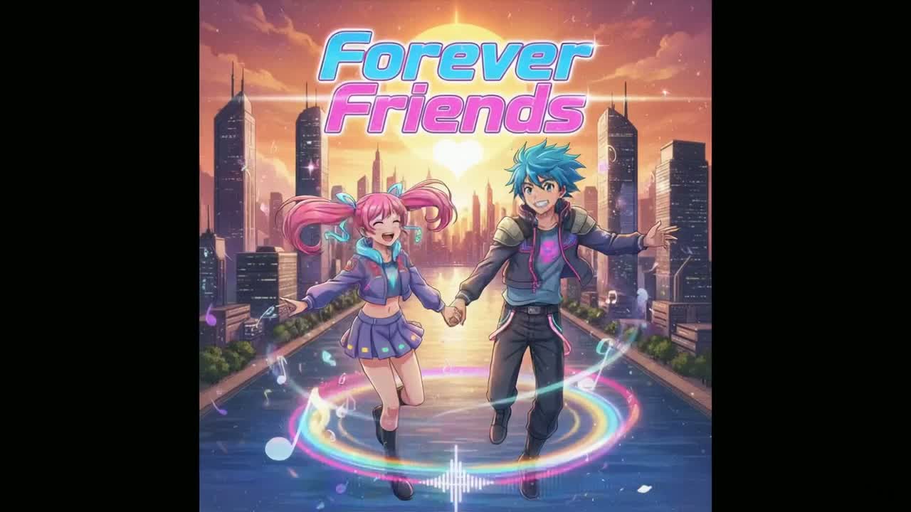A euphoric happy hardcore anthem at 170 BPM blending bouncy basslines, supersaw synths, and shimmering arpeggios, Energetic four-on-the-floor kick drives layered hi-hats and snappy claps, Uplifting female vocals celebrate friendship and togetherness, rising over melodic piano stabs and shimmering pads, Sections alternate between emotional breakdowns with ambient reverb and explosive choruses filled with bright leads, creating a joyful rush of unity and nostalgia