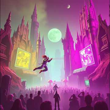 rap, Hyper-fast pop-rap with female vocals over crunchy distorted guitars, bright synth leads, and driving electronic drums, Verses double-time with nimble rap cadences, violin and flute trading quick riffs, Chorus explodes with epic stacked harmonies, wide pads, and a soaring lead line; brief breakdowns strip to guitar and 808-style hits before everything slams back in, Big, animated, energetic arc like a boss-battle theme, female vocals, electronic, violin