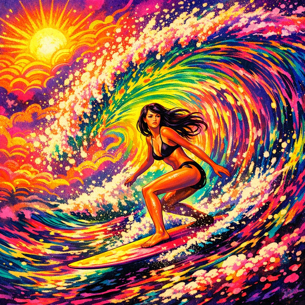 krautrock surf rock, psychedelic garage, 145 BPM, motorik groove with subtle 7/8 accents and phase drift, driving downstroke rhythm guitar with spring reverb shimmer, bright lead guitar cutting through mono mix, fuzz drone guitar creating low-end haze, phase-shifted bass ostinato with sub bass undertone, live drums slightly behind the beat layered with steady four-on-the-floor kick pulse, detuned analog synth blips and tape warble textures, saturated 1960s garage tone, hypnotic repetition with gradual filter morphs and sudden dropouts, shouty male vocals alternating with breathy trance-like whispers, loose phrasing and delayed timing, chant hooks emerging from the mix, playful yet uncanny and subtly seductive atmosphere