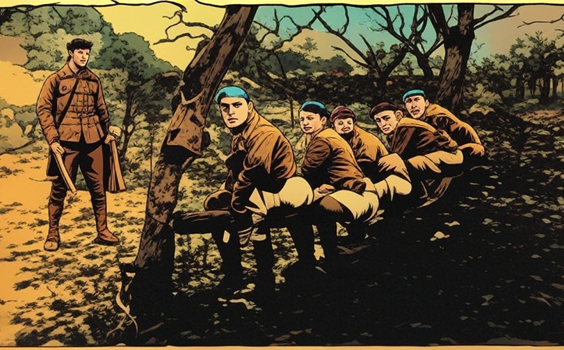 A male German chanson singer from the 1920s performs live, rhythmically accompanying military march music, He delivers brilliant vocals with high-quality recording precision, The audience joins in, singing along to the repetitive parts, The song masterfully blends a happy tone with ironic and sarcastic undertones, incorporating elements of jazz and swing to create a harmonically complex composition