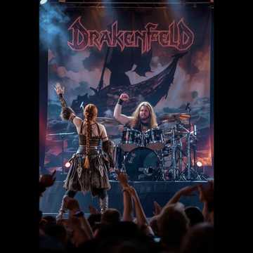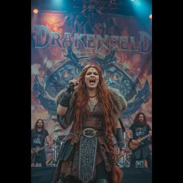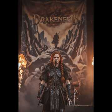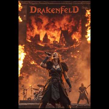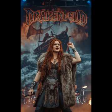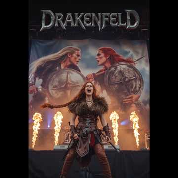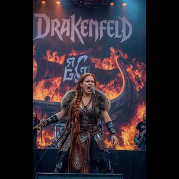 Long live opening before the song starts, Long live female lead singer banter intro, circle pit, violent and energic song, crowd on fire, Live band, crowd cheering, crowd singing, crowd sing-along, live performance, Powerful, energic, powerful live guitar rythm, Live Viking metal / pagan folk / melodic death metal opening by Drakenfeld in London, Begins with ritual Viking acoustic intro (tagelharpa, jaw harp, war drums), gradually building intensity, Huge crowd energy, Metal explosion with distorted guitars, tremolo leads, double kicks, Helena, the female lead singer, speaks to the crowd (no singing): fierce, commanding, warlike banter, Crowd responds with chants, screams, stomps, Sound design includes fire, war horns, wind, Epic cinematic bridge, majestic pagan mood, Climax with full folk-metal fusion, Outro fades with ambient folk textures and crowd cheers, Extreme crowd interaction, festival energy