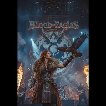 choruses and transitions burst into rapid double-kick, massive crashes, twin-guitar harmonies and Nordic-flavored solos, Bass deep and slightly distorted, Viking horns, low male choirs, and string pads for ceremonial weight, Nyckelharpa/tagelharpa and war drums add ancient color, FX: roaring forge, hammer on anvil, chains, metallic breaths, Vocals: Helena’s clear, powerful voice shifting from epic to semi-guttural, paired with deep male growls, Live crowd: chanting “BLOOD! EAGLE!”, shouting refrains, call-and-response with Helena, moments where voices overwhelm the band