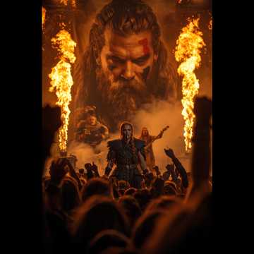 Live female lead singer banter, energic song, crowd on fire, Live band, crowd cheering, crowd singing, crowd sing-along, live performance, Powerful, energic, Melodic Death Metal with Viking Folk Energy – Live Sound, Fast, melodic Scandinavian death metal infused with primal Viking folk, Sharp riffs, controlled blast beats, epic breaks, and haunting melodies, Female lead vocals switch between guttural growls, fierce screams, and incantatory clean chants, Backing male vocals join for war-like calls: “FATHER! — DEAD!”, “BLOOD! — INHERITED!”, Audience roars refrains, stomps feet, chants “RAGE!”, claps in rhythm, Verses: tight and aggressive; choruses: massive, mid-tempo, melodic, Bridge: ritual tension with tribal drums, tagelharpa, and low didgeridoo, Outro: crowd screams final word, FX: war bells, chain rattles, amplified heartbeats, blood impacts, Live ambiance with mic bleed, natural reverb, and arena roar, The child of the berserker rises on stage—ancient rage meets metal fury