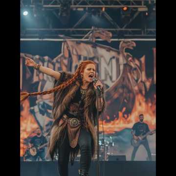 Live female lead singer banter, energic song, violent, fast tempo, crowd on fire, Live band, crowd cheering, crowd singing, crowd sing-along, live performance, Powerful, energic, Hybrid Viking metal — epic, melodic power metal fused with the brutality of melodic death, Sacred, martial atmosphere: a ritual turning into a public execution, Verses in solemn mid-tempo with deep tribal toms and tense palm-mutes;