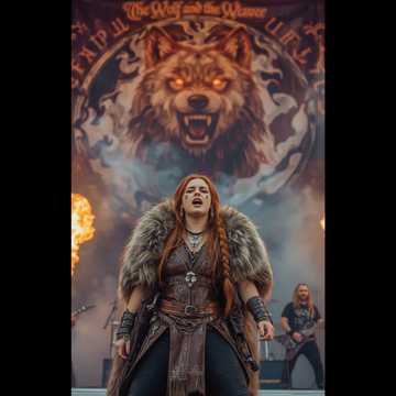 Live female lead singer banter, energic song, violent, circle pit, fast tempo, crowd on fire, Live band, crowd cheering, crowd singing, crowd sing-along, live performance, Powerful, energic, Progressive Mystical Norse Metal – Live Ritual, Acoustic arpeggios in open tunings weave through shifting tempos and sudden explosive riffs, Down-tuned electric guitars, odd meters, and breaks mirror fate’s unpredictability, Mystical female vocals alternate between whispers, ethereal howls, and primal growls, Live crowd claps, chants, stomps during crescendos, Sampled loom sounds—pedals, shuttles—processed as rhythmic textures, Male throat singing adds ritual depth, like wolves circling a fire, Drums are tribal and progressive: floor toms, syncopated cymbals, polyrhythms, Nordic bones, frame drums, and tagelharpa drones ground it in myth, Raw live mix: audience shouts, unison chants, singer fades as myth breathes through the crowd, A ceremony woven in thunder and thread