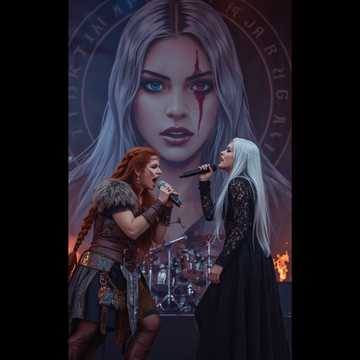 Long talking intro, Long Live female lead singer banter, emotive live, Live band, crowd cheering, crowd singing, crowd sing-along, live performance, energic, crowd singing the chorus alone, Ethereal Gothic Ritual Live, A fusion of haunting gothic piano, ancestral Nordic instruments, and two powerful female voices: MiN’s trembling, ethereal softness and Helena’s visceral rage, The song opens with a crystalline piano, layered with subtle electro delays, then builds into tribal frame drums, distorted bass pulses, and glitchy martial beats, MiN whispers, Helena howls — they answer each other in broken harmonies, Live ambiance is crucial: crowd echoes refrains, chants lines like a shared incantation, Tagelharpa and nyckelharpa bring ancient tension; Nordic flutes cut through the mist, Male opera-style backing vocals rise like forgotten gods, A modern pagan ritual — fragile, furious, and transcendent