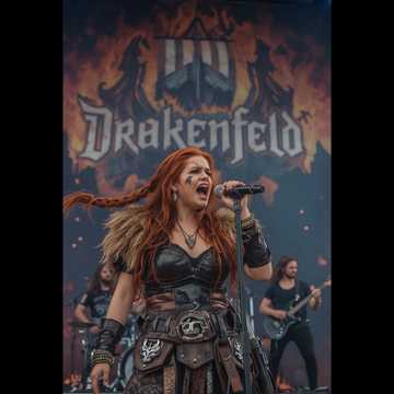 Live female lead singer banter, energic song, violent, crowd on fire, Live band, crowd cheering, crowd singing, crowd sing-along, live performance, Live Viking folk-to-black metal fusion, Starts as a drunken tavern folk fest with frame drums, bodhrán, nyckelharpa, dissonant bagpipes, flutes, Guitars playful in triplets, bass round and festive, Vocals: Helena, female lead, clear and commanding, like a tavern queen, Audience loud, chanting “HEY! HEY!”, clapping, singing refrains in wild chorus, sometimes overpowering the band, Tempo unstable, syncopated, collapsing and rising like staggering dancers, Mid-song: instruments twist, folk lines turn dissonant, whispers and demonic tavern laughter creep in, Shift into melodic black metal: tremolo guitars, double pedal drums, deep growls duet with Helena’s mystical clear vocals, Audience is central, chanting incantations, drunken, possessed, creating ritual intensity, Ends dark, prophetic, trance-like, with crowd and Helena merging in chaos
