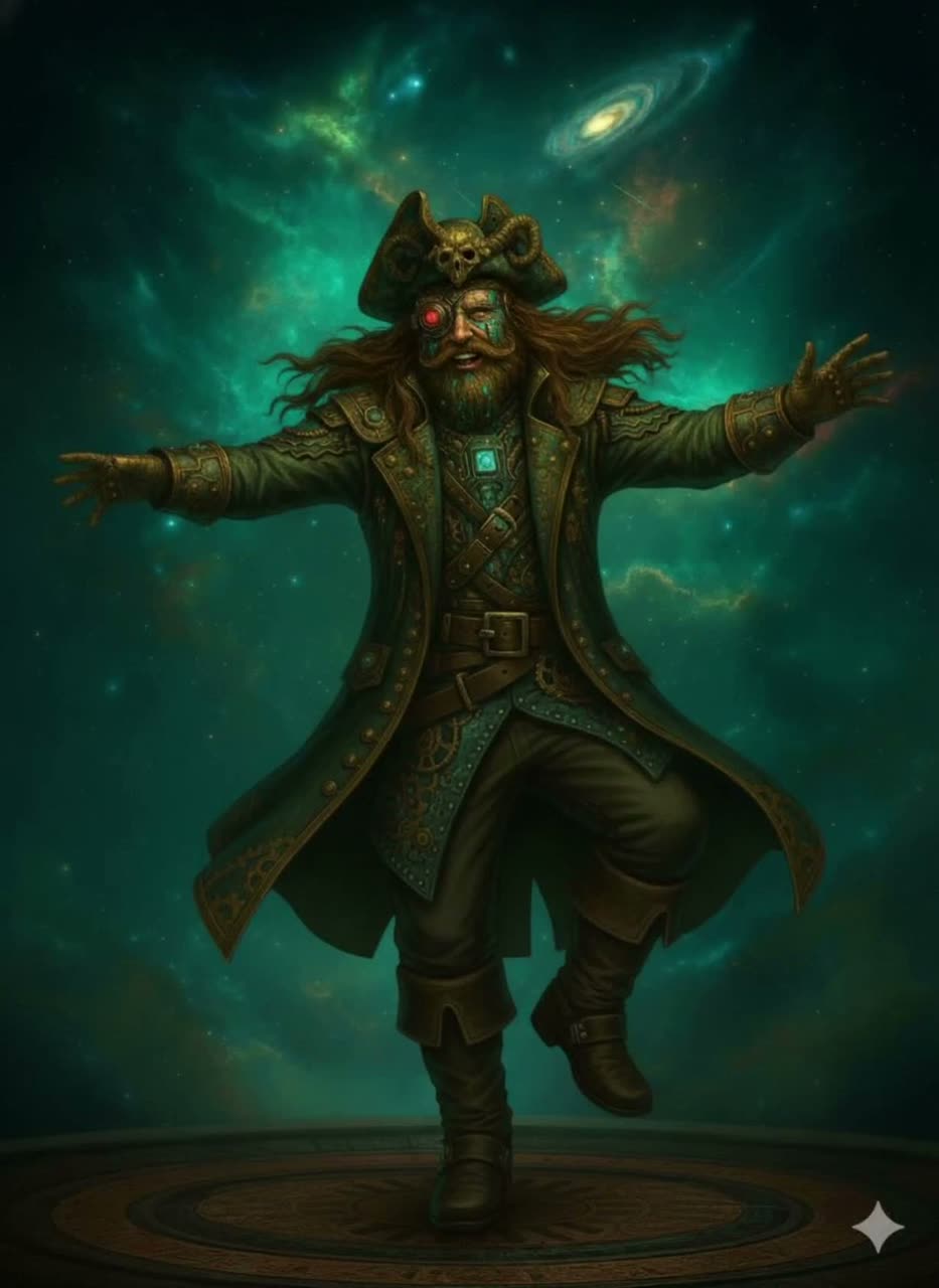 Playful, bubbly pirate‑lounge groove with whimsical energy, Warm acoustic instruments in a cozy tavern‑on‑a‑ship setting, Bouncy upright bass, brush drums, and jaunty acoustic guitar, Light accordion or concertina used sparingly for charm, Violin that flutters in like a curious bird, doing small melodic flourishes, Soft marimba, celeste, or toy‑piano accents for a magical, bubbly feel, Gentle spark‑synths and tinkerer‑style bloops for a subtle sci‑fi edge, Vocals warm, relaxed, storyteller‑style — like someone leaning back in a chair, Overall vibe: whimsical, friendly, slightly tipsy, full of heart and camaraderie, Feels like a late‑night jam between oddball geniuses on a cozy wooden ship, Not flashy, not braggy — just a playful groove that keeps rolling