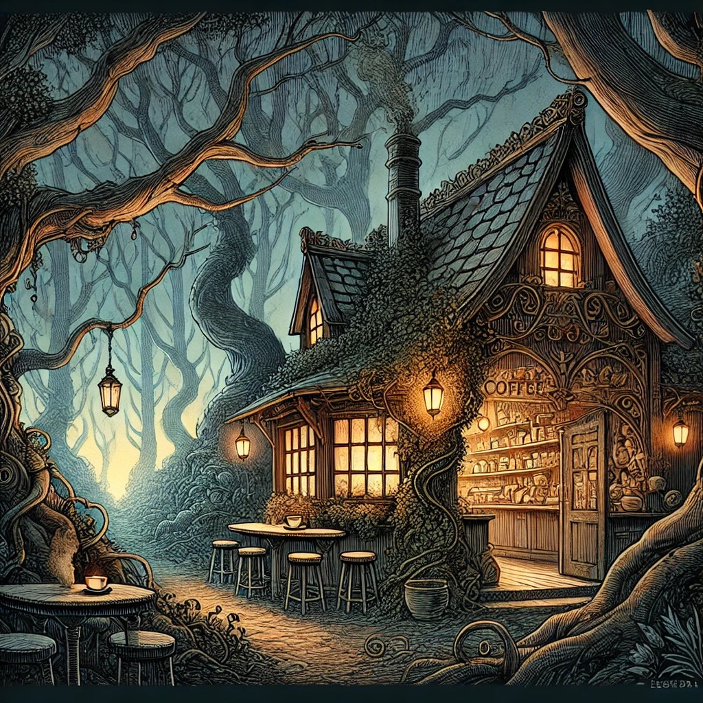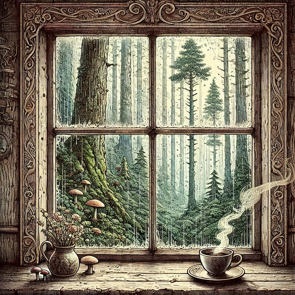 Slow tempo Musette waltz in triple time(“oom-pah-pah” style), Accordion as lead instrument, Mood:Nostalgic, Melancholic, Sorrow, Mysterious, Bittersweet, Poignant, Inspired by 1950s Old Coffee house in a forest tucked in a quiet alley, with rain tapping on the window