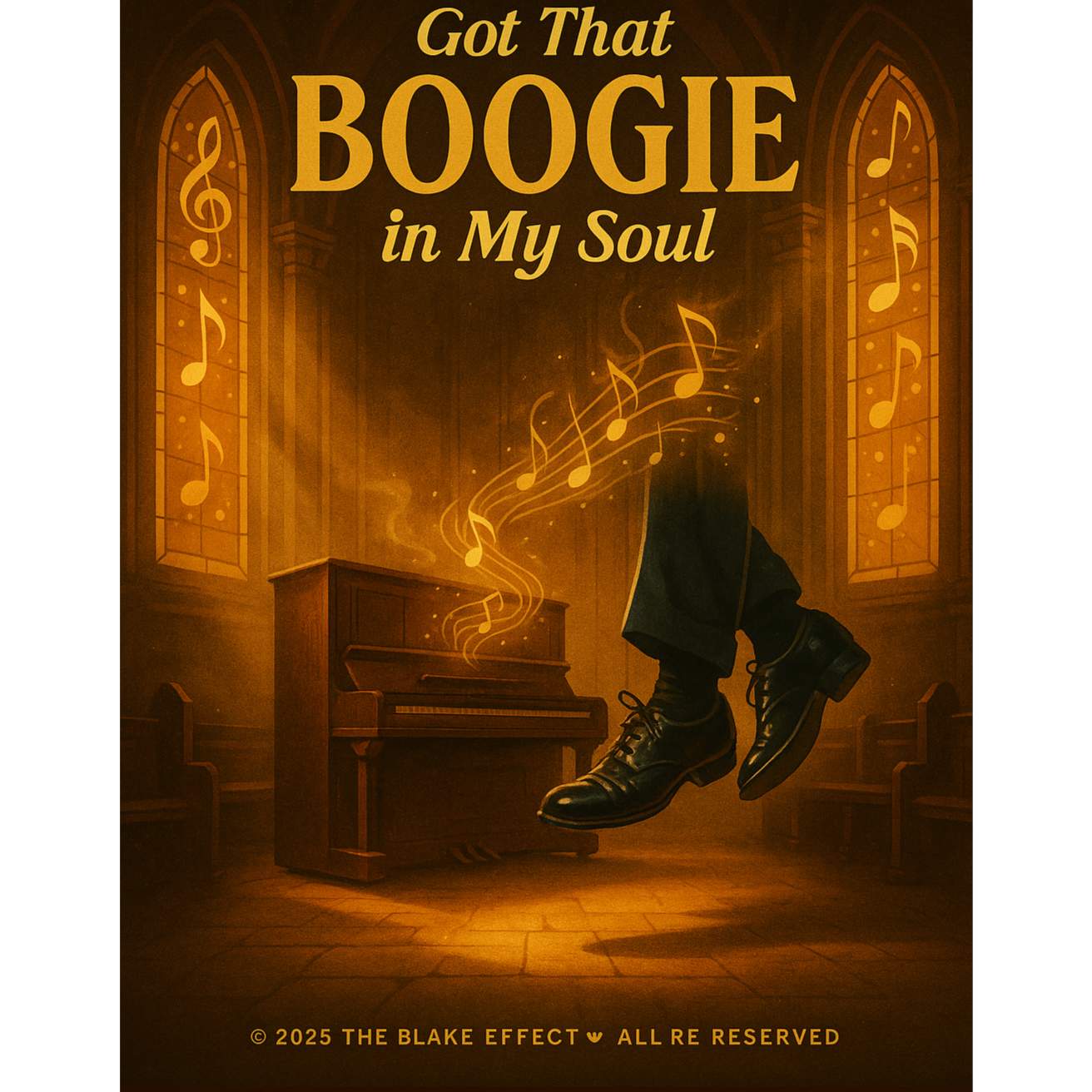 Fast, upbeat, rolling piano riffs, toe-tapper groove, fun and irresistible, Feels like a boogie revival in a tiny wooden chapel with the roof about to lift, Atmosphere: