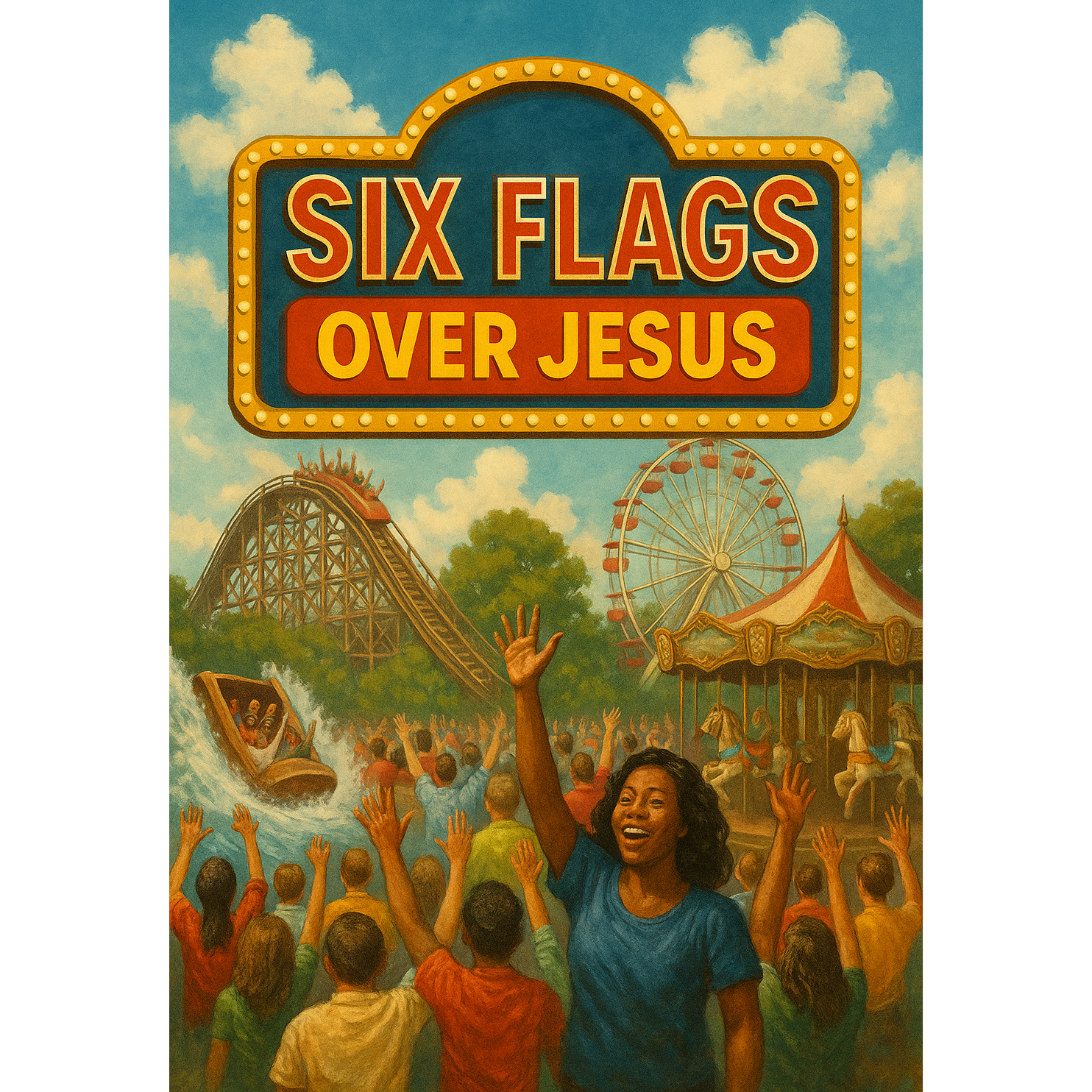Fun, chaotic, joyful, theatrical, holy-roller amusement park vibe, Feels like a revival service mixed with a comedy musical inside