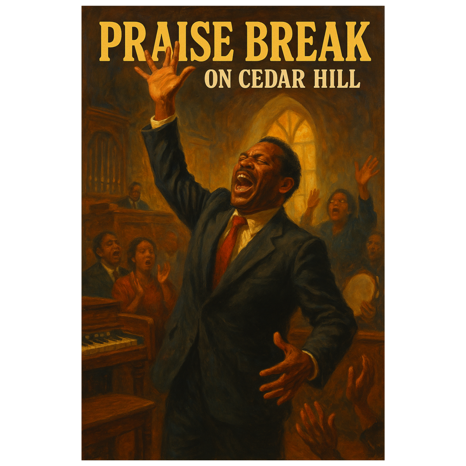 Full gospel choir (call & response, loud, joyful, comedic timing)