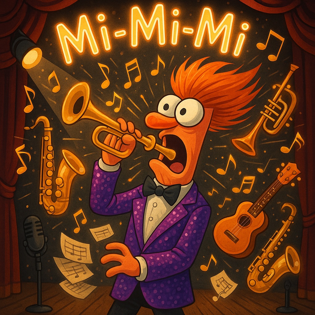 Genre: Whimsical jazz-pop with cartoon swing influences, centered on saxophone, muted trumpet, and upright piano in a tight trio format, Style: Vocal scatting and playful nonsense dominate the verses, contrasted by theatrical irony and rapid-fire falsetto in the chorus, Mood: Energetic, cheeky, and lightly melancholic, A blend of joy and dramatic silliness, Singer's Voice: High-pitched, expressive male vocals with animated bursts and falsetto quirks; scat voice treated as melodic instrument, Chorus vocals shift into extremely high-pitched, fast-paced falsetto โMi-Mi-Miโ refrains, Instrumentation: Verses feature call-and-response between piano stabs and sax lines, with bright trumpet fills, The chorus contrasts kazoo-driven ukulele strums at fast tempo with slow, emotive piano and cello layers, Mastering: Balanced stereo mix with crisp brass, soft dynamic shaping, and characterful contrast between lo-fi and clean textures, studio quality, high-fidelity, best quality production
