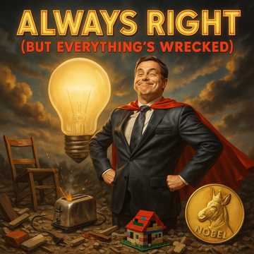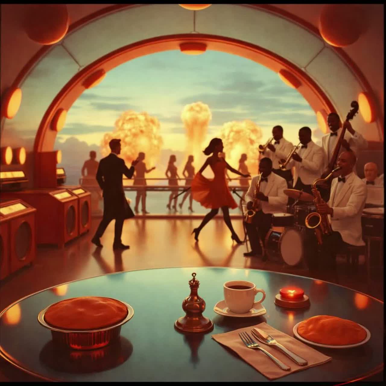 1950s swing jazz with an upbeat big band groove inspired by classic American radio entertainment, Medium-fast swing tempo with walking upright bass, brushed swing drums, crisp hi-hat, and subtle rim accents, Prominent brass section with muted trumpets, warm trombones, and tight horn stabs, supported by swinging saxophone lines, Piano comps in classic swing and light stride style, Warm 1950s electric guitar provides steady Freddie-Green-style rhythm comping with tasteful single-note fills and short melodic solos, lightly tube-driven, Vocals: smooth male crooner lead, warm and confident with ironic calm and classic phrasing, Clear diction, gentle vibrato, front-of-mix presence, Repeated sung exclamations of โBoom!โ act as musical accents, delivered rhythmically and expressively: restrained and dry in verses, confident and punchy in choruses, heavier and more emphatic toward the finale, Background vocals minimal, limited to subtle jazz harmonies