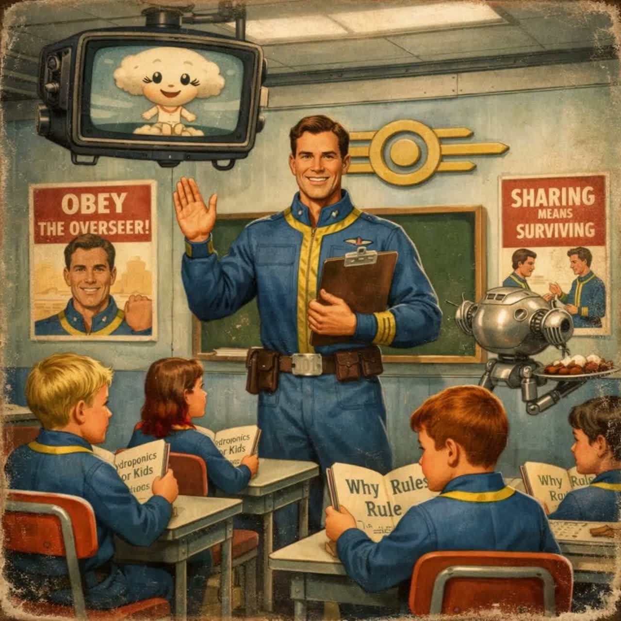 1950s Rockabilly, childrenโs song, Doo-Wop harmonies, upbeat schoolhouse rhythm, male vocal, children's vocals, children's fun, children's laugth, 1950s radio broadcast, vinyl crackle, 78rpm surface noise, lo-fi, mono, nostalgic, war-time radio